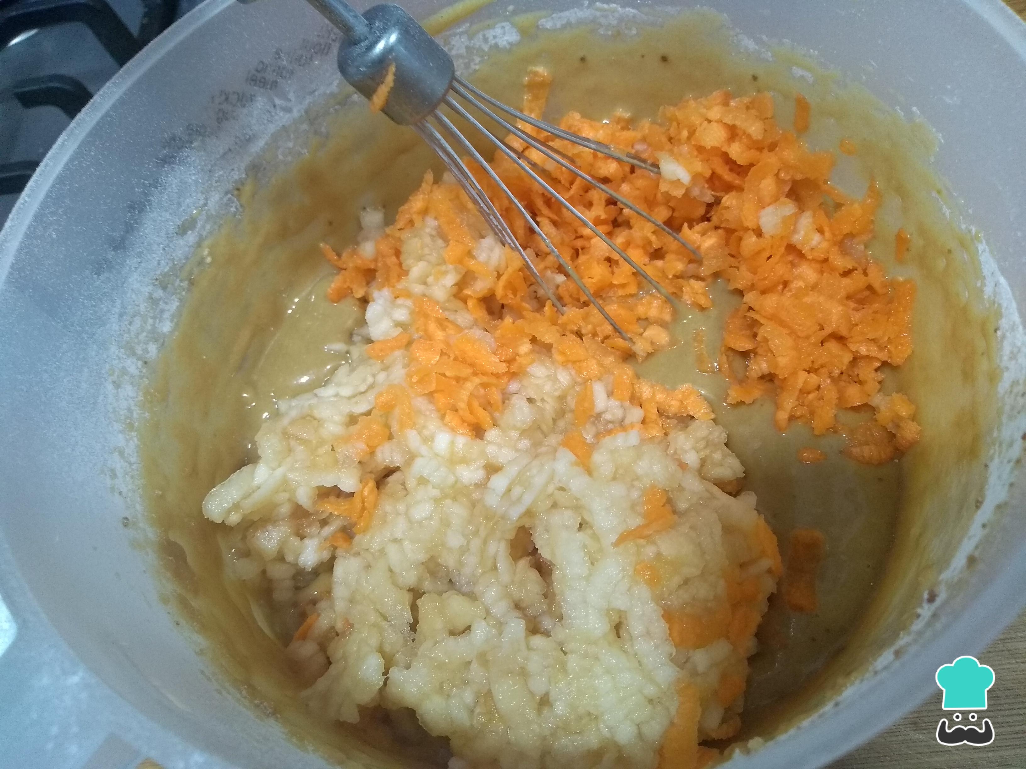 Añade la zanahoria y la manzana ralladas y bate hasta que queden bien integradas en la masa. No es necesario mezclar demasiado porque la masa ya está hecha, simplemente es para que se distribuyan la manzana y la zanahoria.