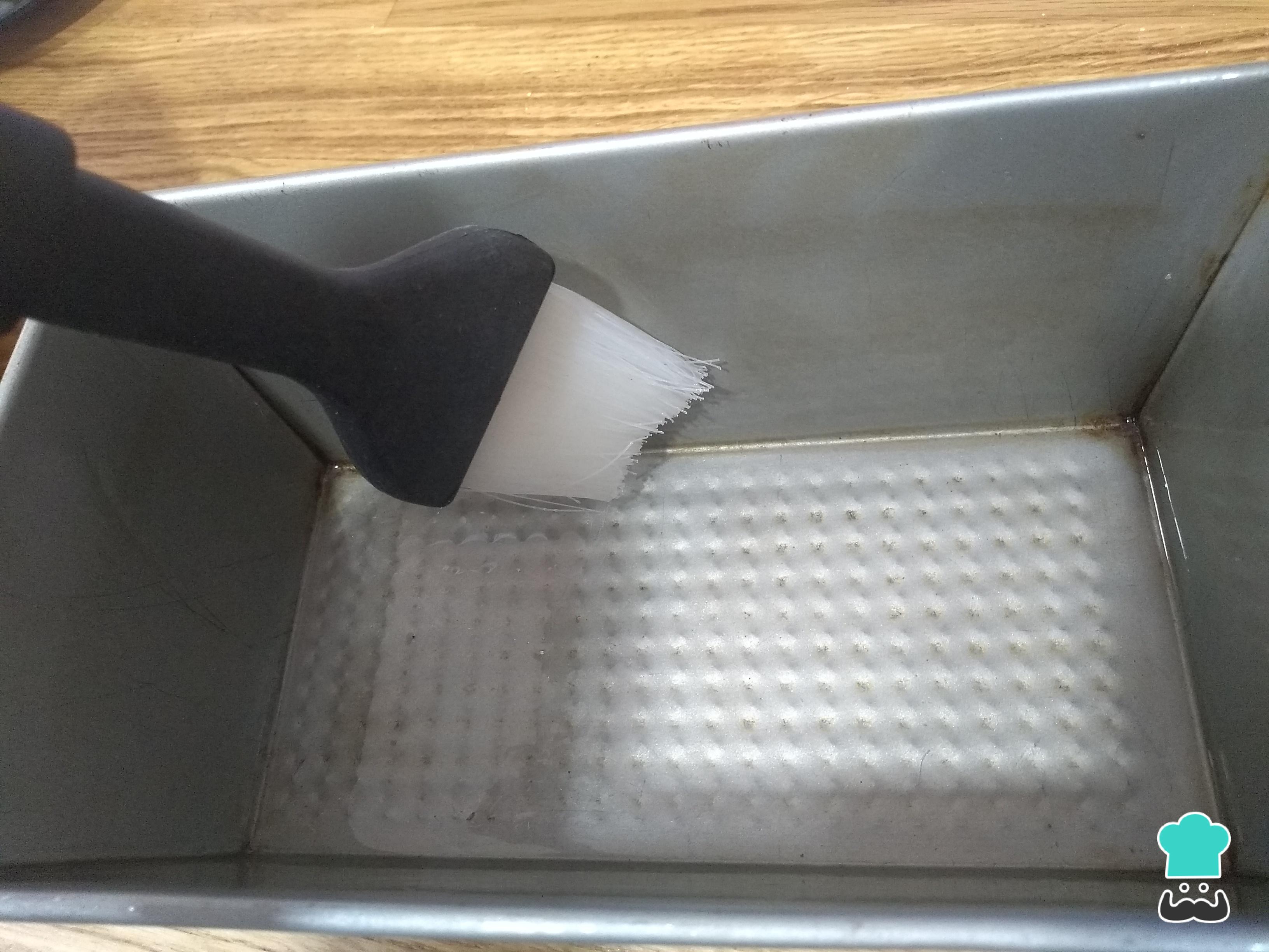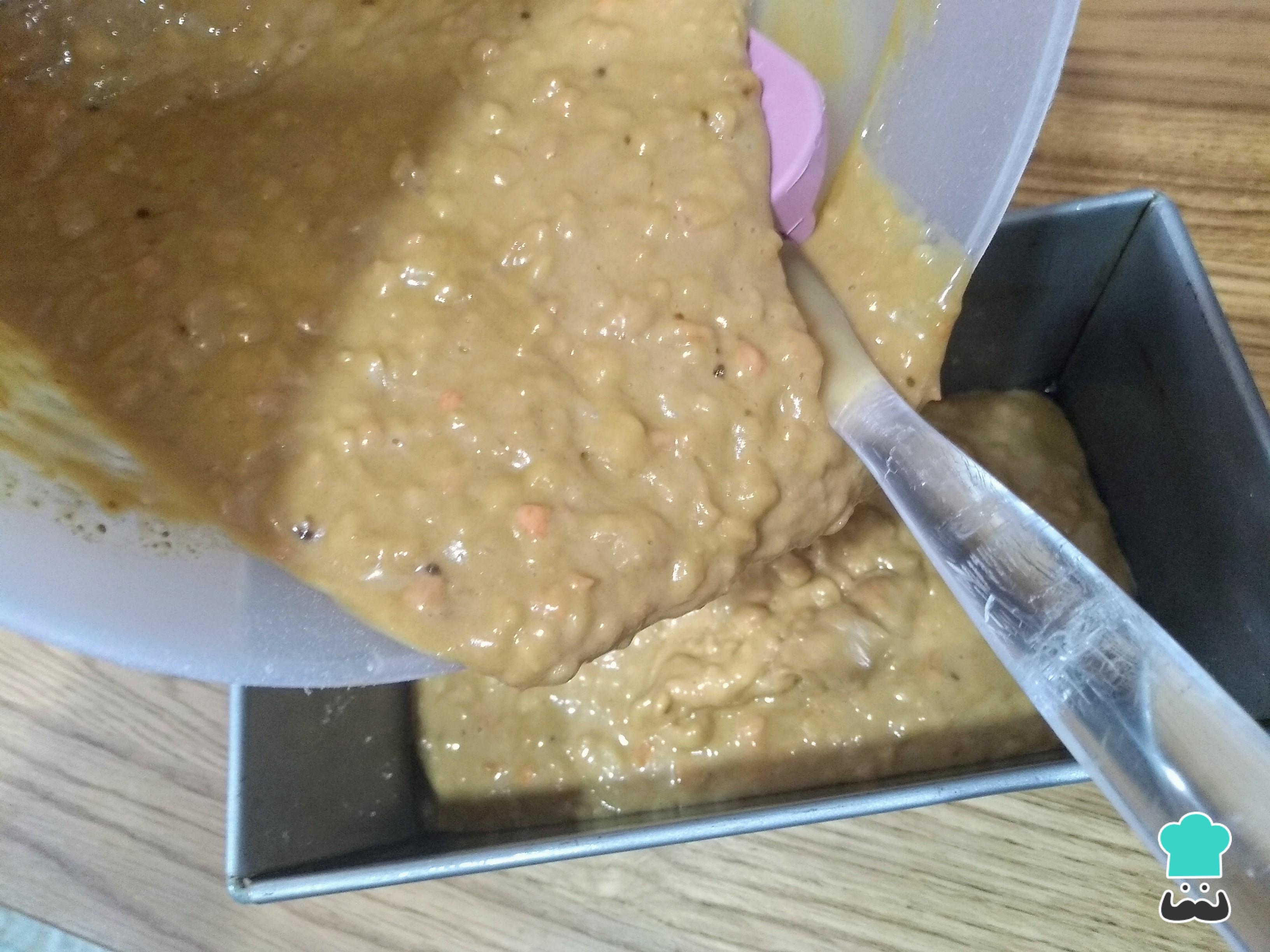 Engrasa un molde con mantequilla o aceite, el nuestro es rectangular de 25x11x8 cm. También puedes forrarlo con papel de hornear, lo importante es que el bizcocho de zanahoria y manzana no se pegue durante la cocción.