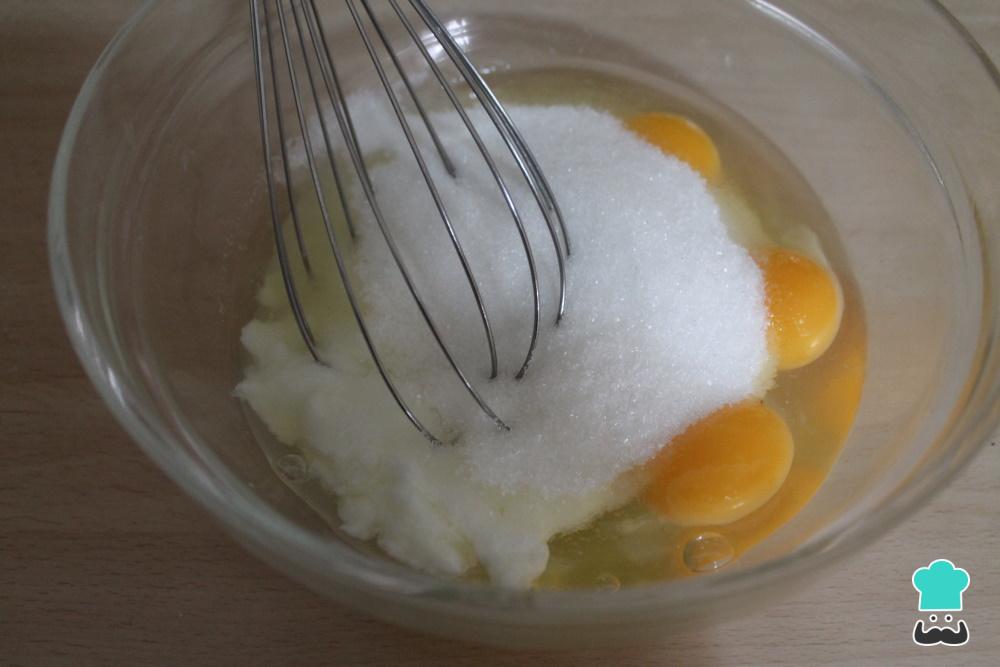 En primer lugar, precalienta el horno a 180 ºC. En un bol amplio vacía el yogur. No tires el envase, te va a servir como medida para el resto de ingredientes. Casca los tres huevos también en el bol. Mide dos envases de yogur con el azúcar y añade igualmente al bol. Bate hasta integrar bien los ingredientes.