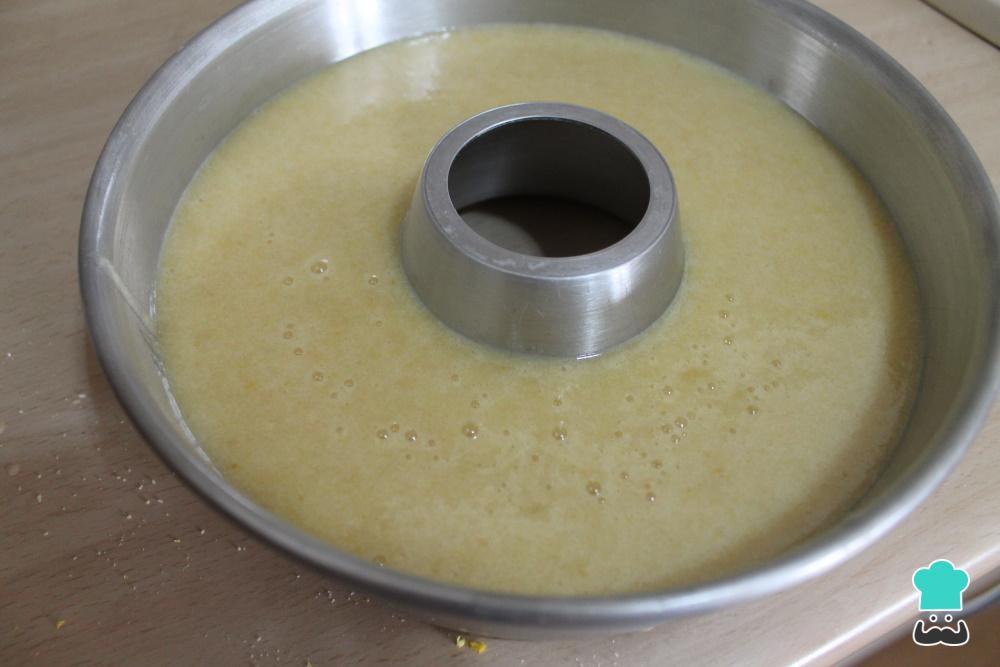 Engrasa un molde redondo amplio y vierte la masa en él. Hornea con calor solo abajo a 180 ºC durante 45 minutos. A mitad de cocción, pon también el calor arriba y abajo para que el bizcocho se dore un poco. Pincha el bizcocho con un palillo largo para comprobar que está cocido. El palillo tendrá que salir sin restos de masa. El bizcocho sube bastante, pero una vez fuera del horno, tiende a bajarse como si fuera un suflé, eso es normal.