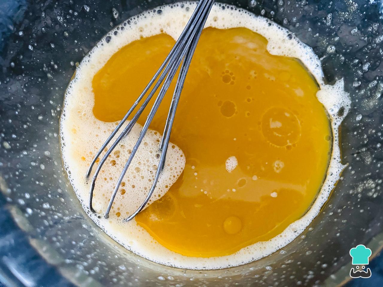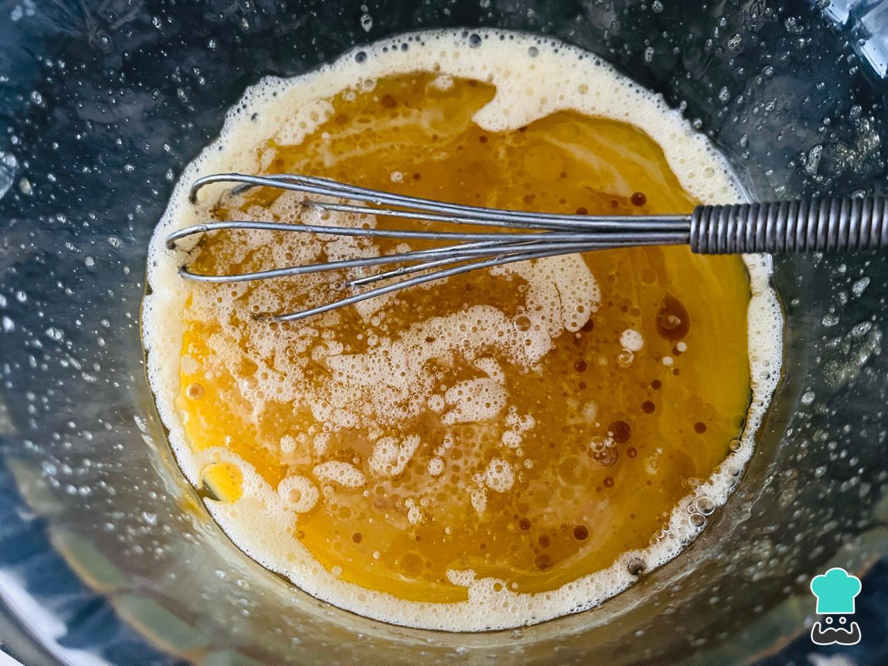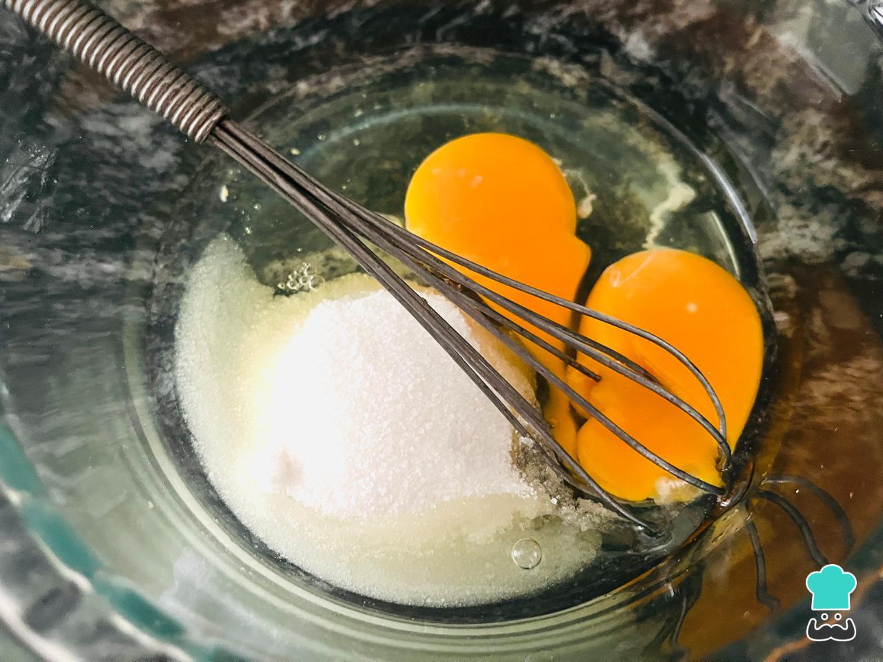 Bate los huevos a temperatura con el azúcar. Si eres de los que no les gustan las preparaciones tan dulces, recomendamos reducir la cantidad de azúcar a 1 taza.