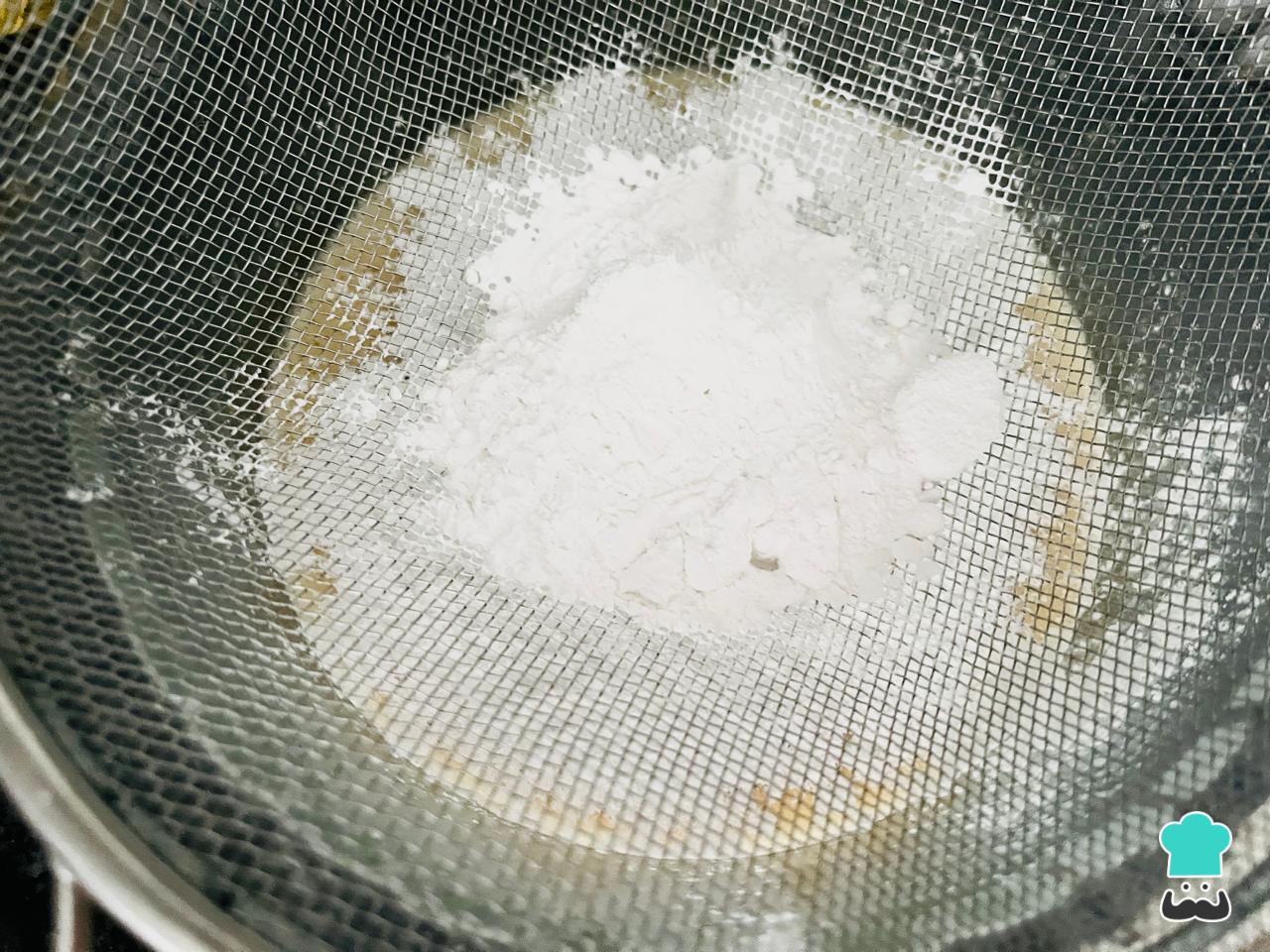Agrega una de las tazas de harina con ayuda de un tamiz de cocina, integra con movimientos envolventes.