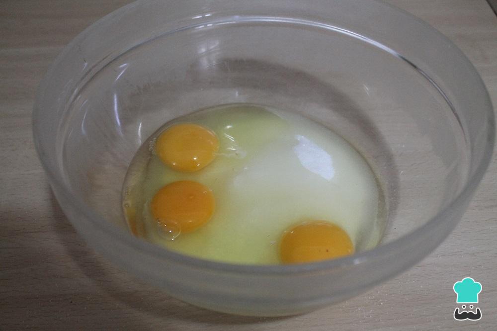 Pon en un bol amplio el azúcar con los huevos y bate hasta que la mezcla quede blanquecina.