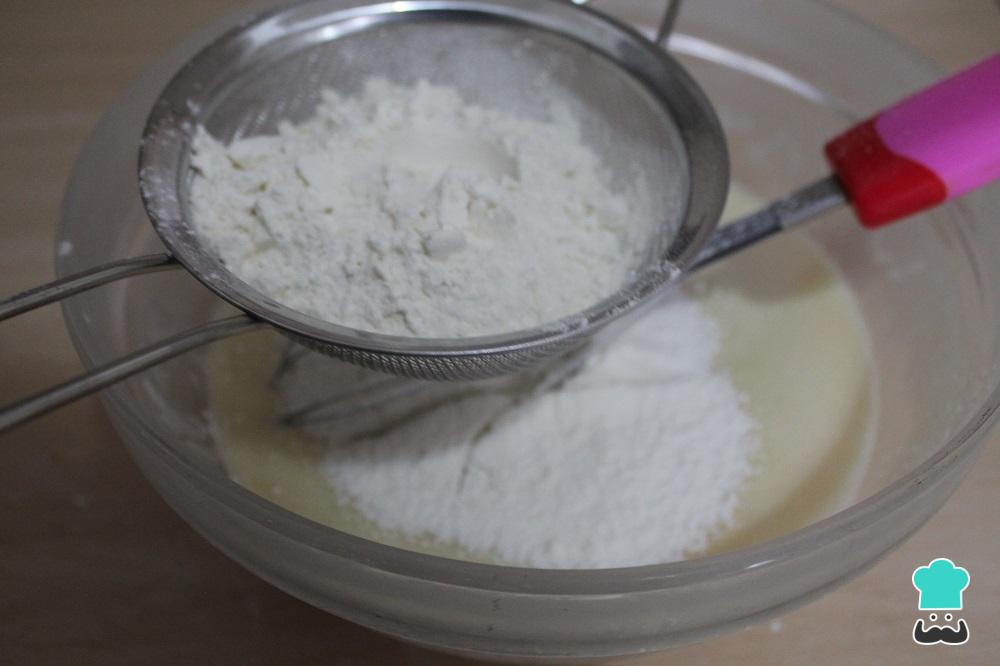 Mezcla la harina junto con la levadura química y tamiza ambas encima de la mezcla anterior.