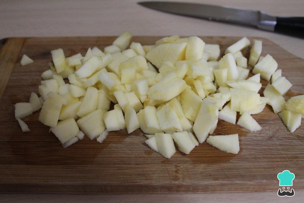 Precalienta el horno a 180 ºC. Descorazona y pela las manzanas. Parte una de ellas por la mitad y a su vez en trocitos pequeños. Reserva las otras dos.