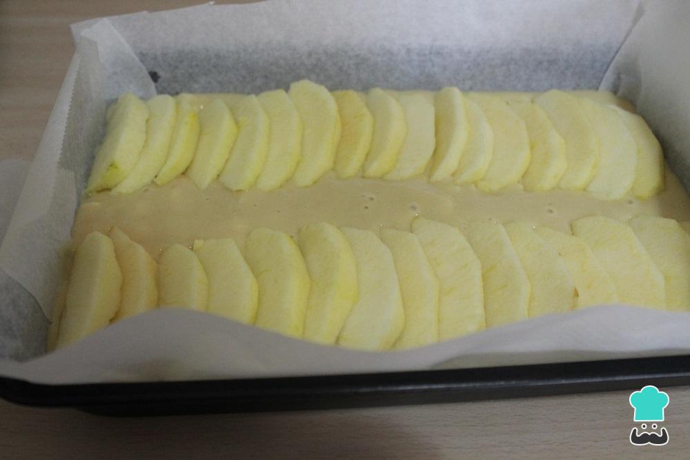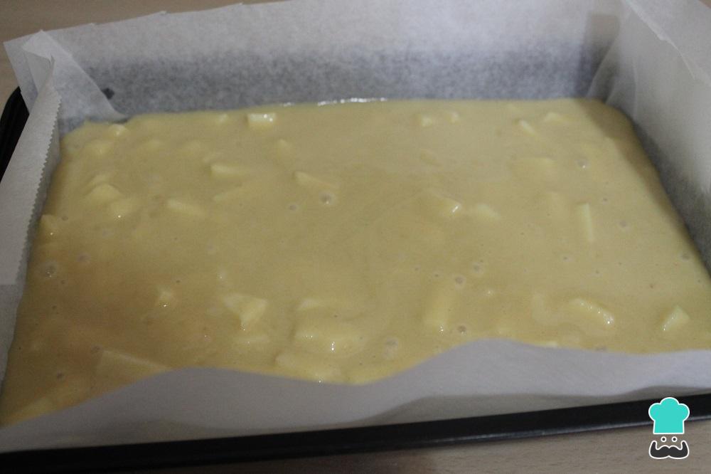Forra un molde rectangular con papel de horno de unos 26x16 cm. Vierte la masa del bizcocho de manzana encima.
