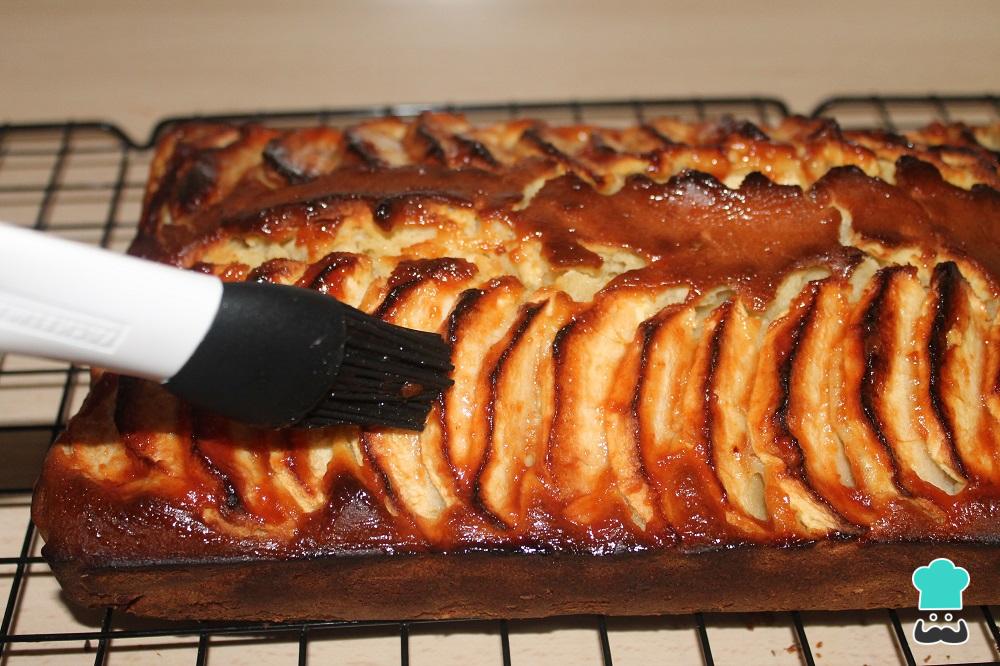 Deja enfriar encima de una rejilla. Si quieres darle un poco de brillo al bizcochuelo, derrite una cucharada de mermelada con unas gotas de agua en el microondas. Utiliza una mermelada preferiblemente de color claro, como la de melocotón, albaricoque o membrillo. Pincela la superficie del bizcocho con ella.