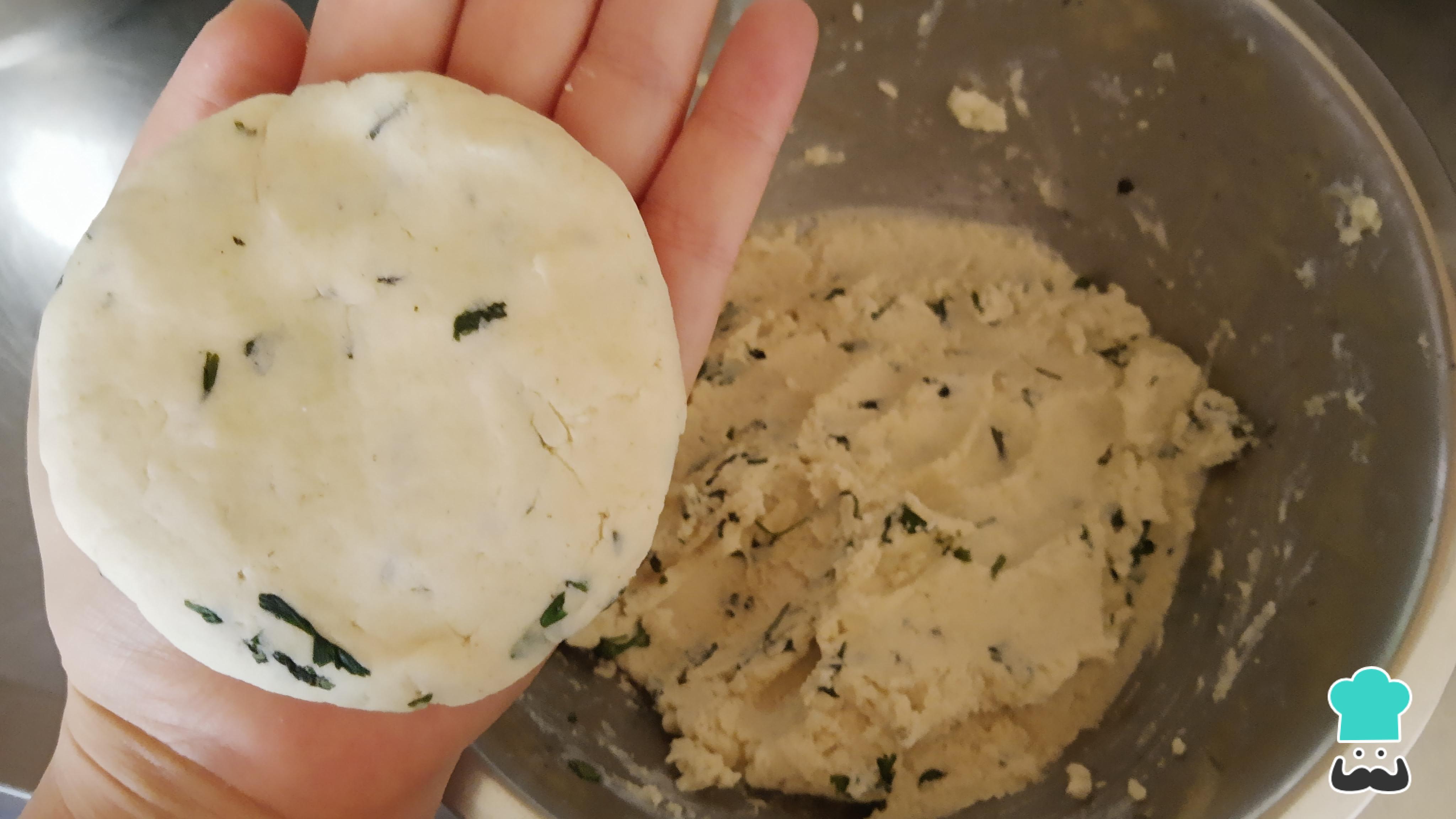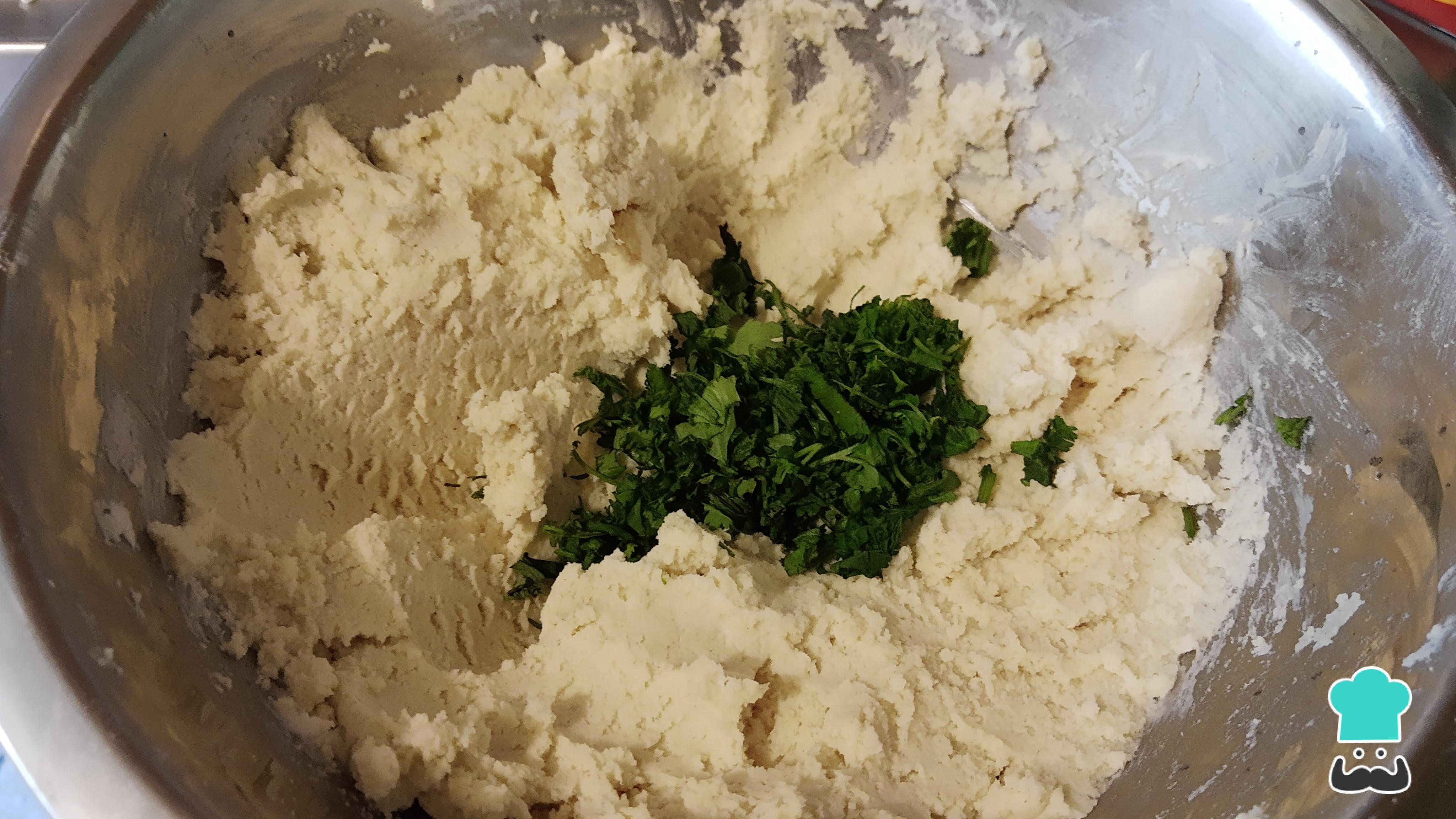 Agrega media taza de cilantro finamente picado, si lo prefieres, también puedes usar el cilantro solamente troceado o solo las hojas. A continuación, mezcla muy bien hasta que se integren por completo todos los ingredientes. Además, si observas que la masa está muy seca, puedes agregar un chorrito de agua tibia o caldo de pollo y, luego, dejar reposar mientras continúas con la receta.
