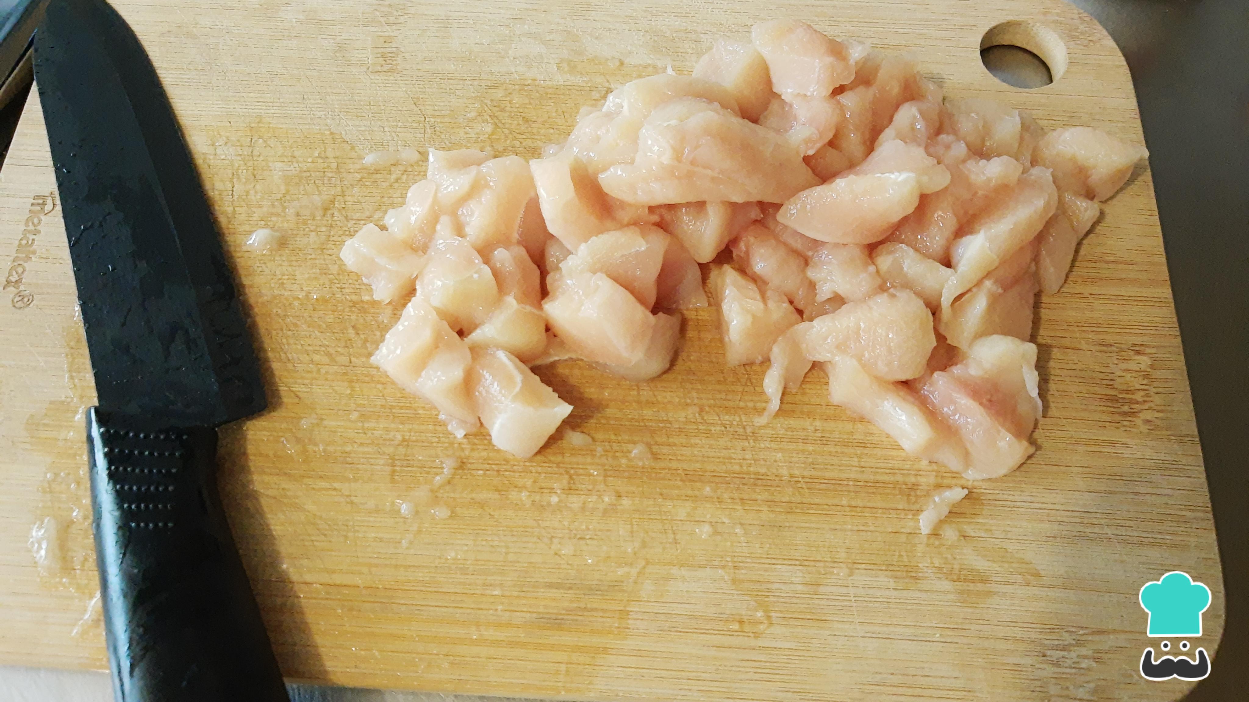 Para el relleno vamos a preparar un pollo a la mexicana. Para ello, corta en trocitos el pollo, que puede ser en fajitas o pechuga, incluso puedes usar desmenuzado ya cocido. Si decides utilizar pollo desmenuzado y al momento de cocinar quieres agregar sazón, añade unas hojitas de laurel y un par de clavos de olor.