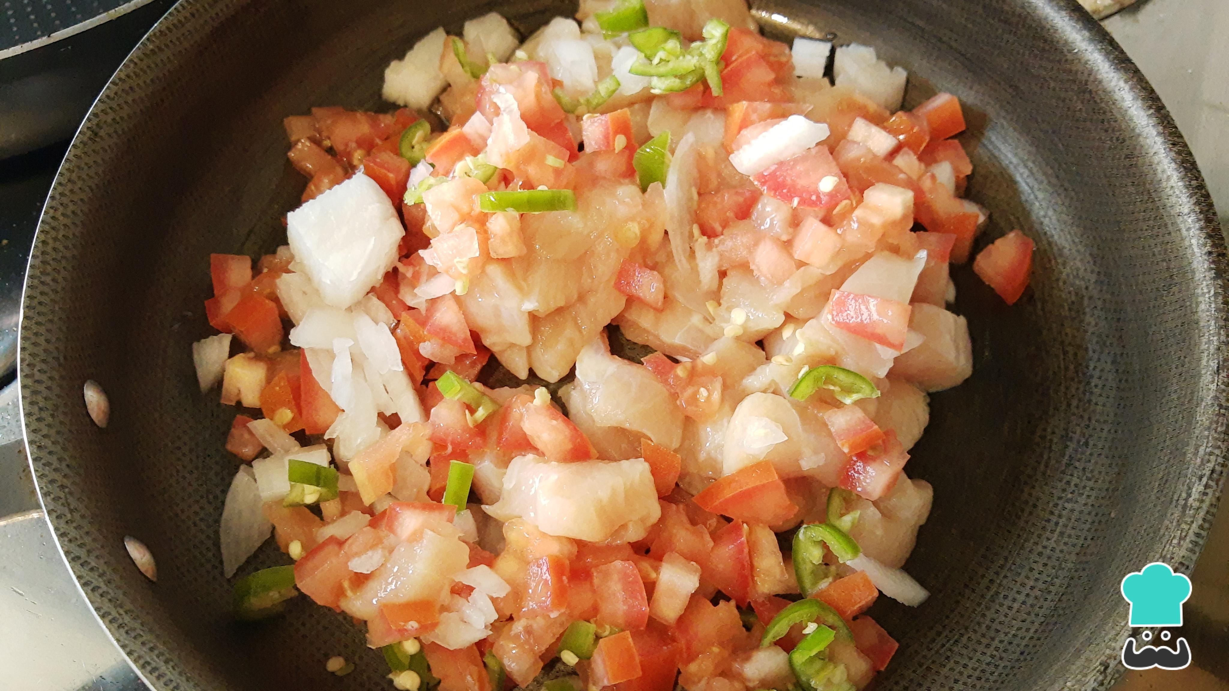 En una sartén calienta 2 cucharadas de aceite vegetal y añade la cebolla, el jitomate, el chile serrano y el pollo picado. Asimismo, agrega un poco de sal y cocina moviendo constantemente durante 5-7 minutos, cuando esté listo, retira del fuego y reserva.