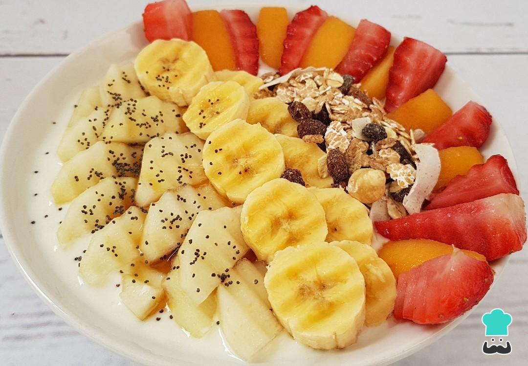 El yogur es uno de los productos más utilizados en los desayunos, sin embargo, no todos los yogures son saludables, puesto que muchos de ellos llevan exceso de azúcares refinados añadidos y grasas. El yogur vegetal es la opción más saludable, ya que no contiene grasas que contribuyan al aumento del colesterol y las cantidades de azúcares son más moderadas. Para este desayuno he utilizado el yogur natural de coco, y para convertirlo en un desayuno más completo he añadido muesli y frutas. Si el yogur te parece demasiado agrio, puedes utilizar algún edulcorante sin refinar, por ejemplo, stevia, sirope de arce o miel de palma. Puedes tomar este bol de frutas con yogur no solo como parte de tu desayuno, sino también como un snack de media mañana, como merienda o como postre.