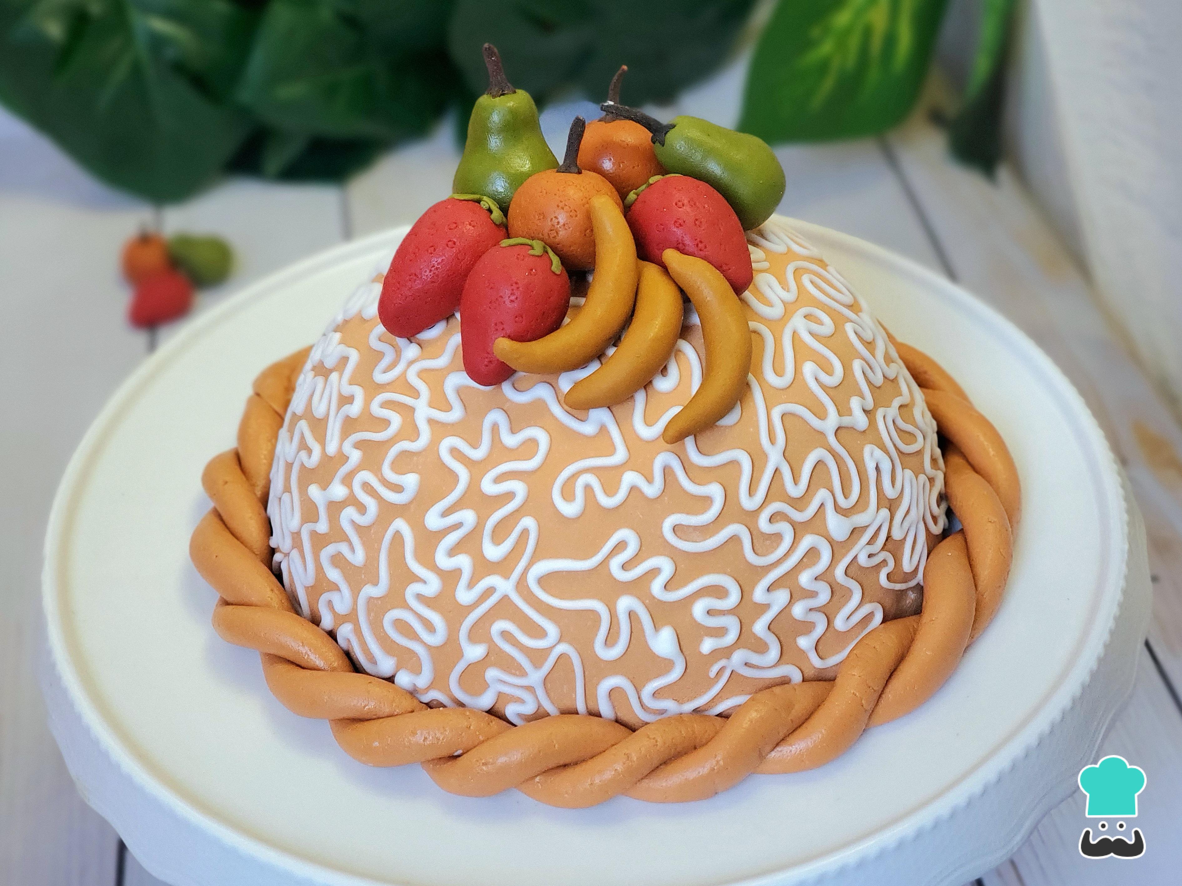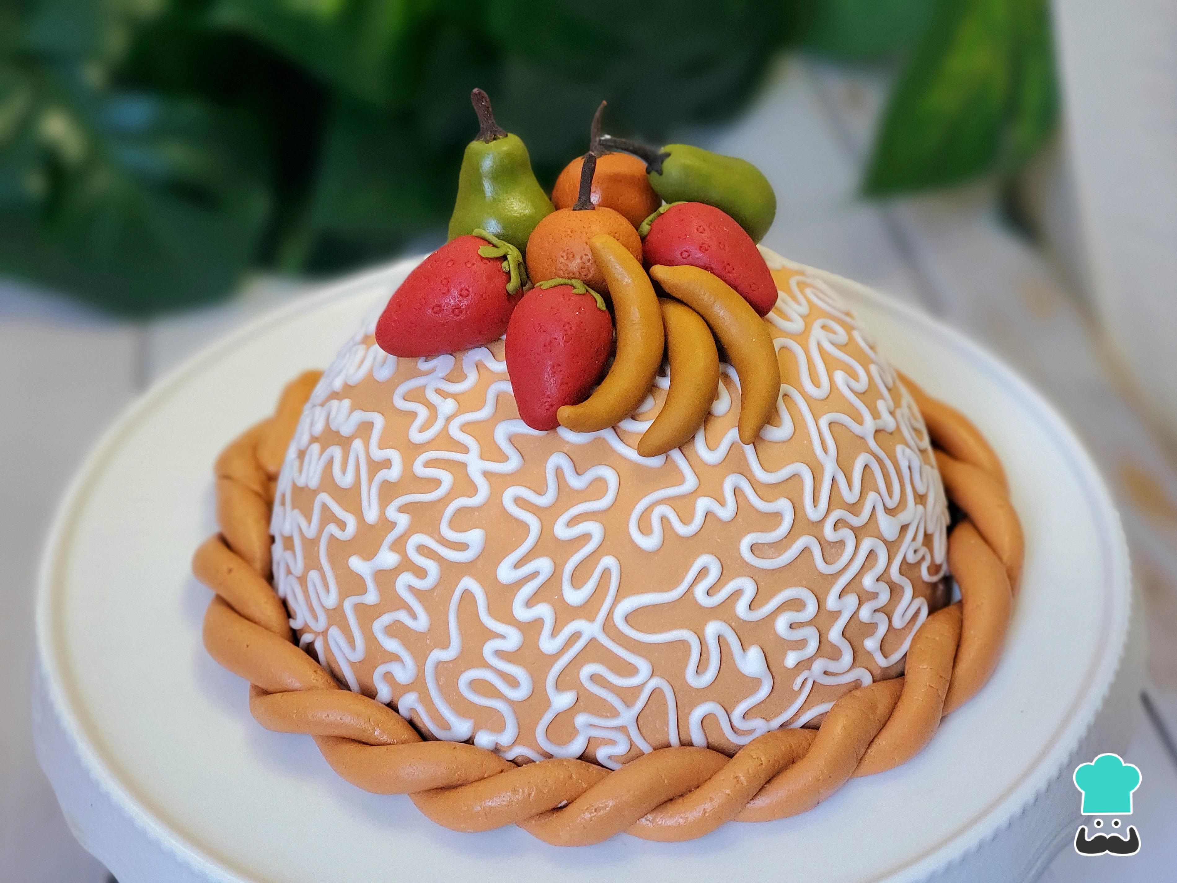 Amasa el maná y reserva un poco para hacer las frutas de decoración. Luego, estíralo hasta que tenga el doble de tamaño que la torta y cubre, que debe estar untada por la superficie con el manjar de yemas. Forra bien y corta el exceso. Vuelve a amasar el excedente y realiza dos rollitos delgados para entrelazarlos y decorar el borde.