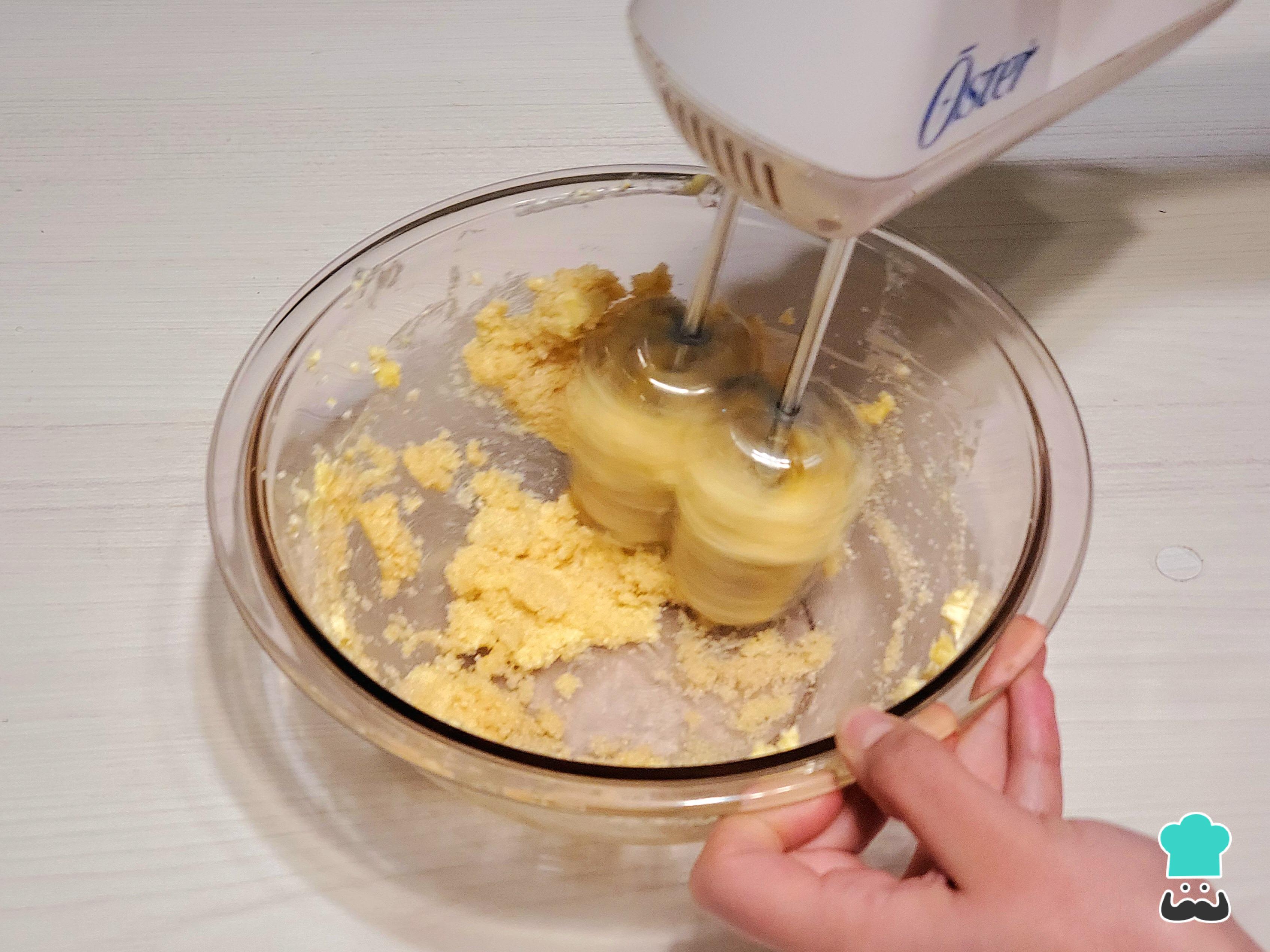 Empieza preparando el bizcocho. Coloca la mantequilla, que debe estar a temperatura ambiente, junto con el azúcar y bate a máxima velocidad hasta que se convierta en una crema suave y untable.