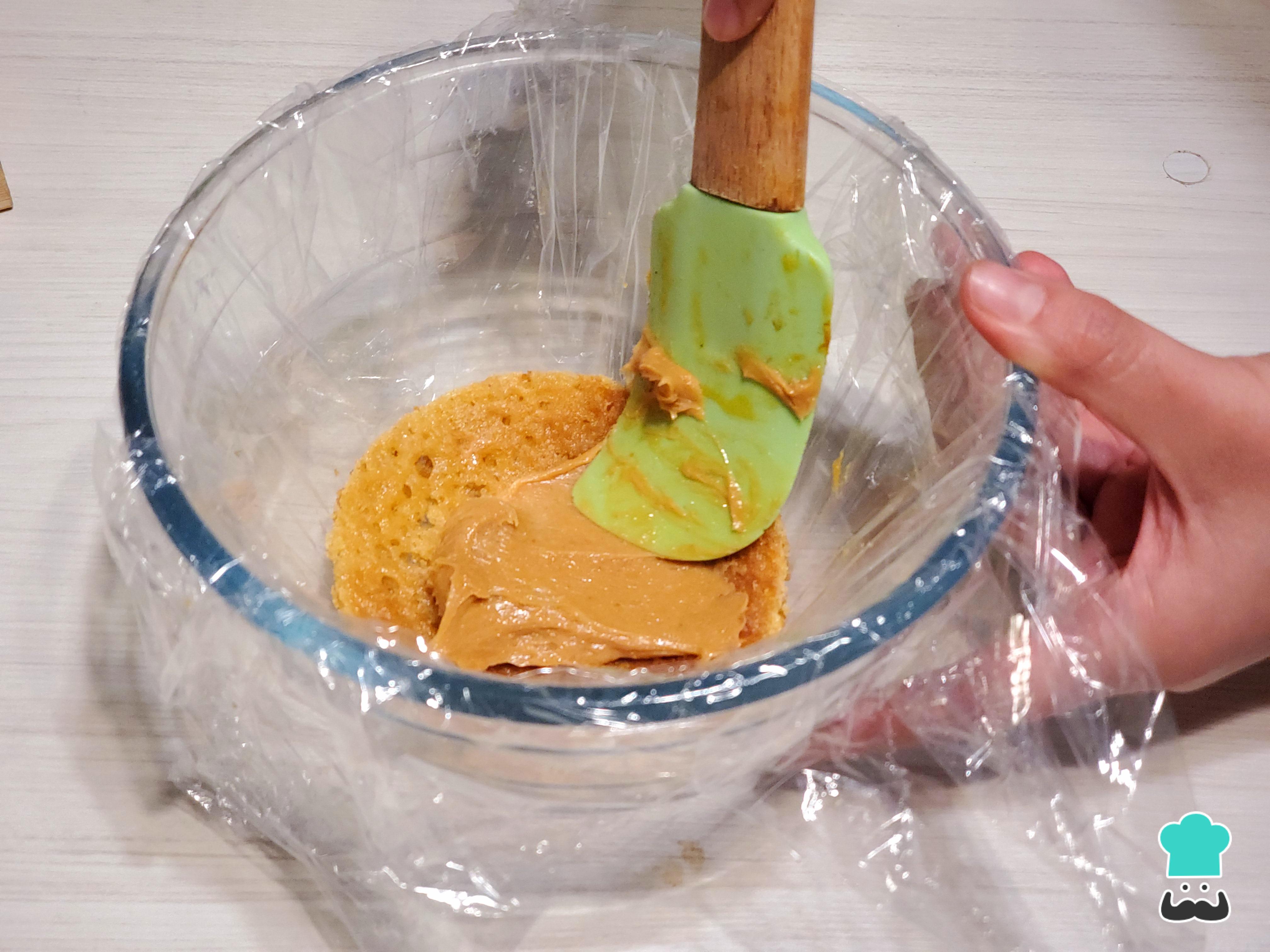Empieza armando la bola de oro. Forra la parte interna de un bowl semicircular y comienza a colocar un disco pequeño de bizcocho. Coloca una capa del manjar de yemas, encima mermelada de albaricoque, luego cubre con otro bizcocho. Después, una capa del manjar de pecanas y cubre con otro bizcocho.