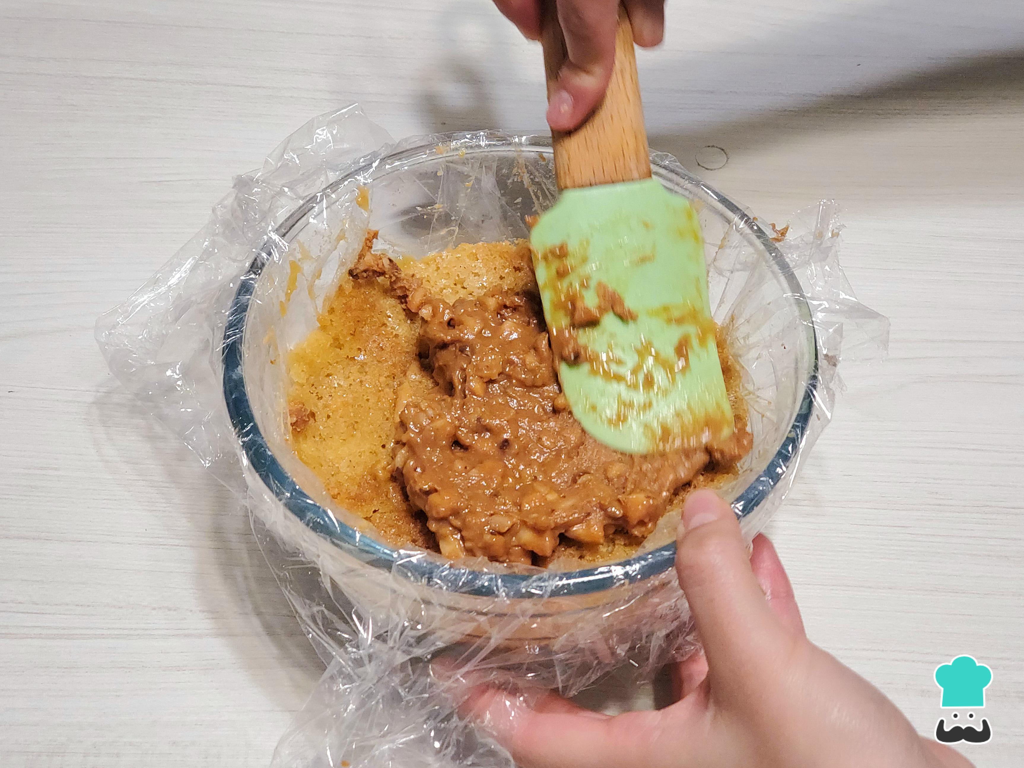 Repite las mismas capas hasta llenar al ras del bowl y cubre con papel film. A continuación, con una tabla o un plato plano, aplasta la superficie para que se compacten las capas. Refrigera durante toda la noche y, al día siguiente, desmolda y retira el papel film.