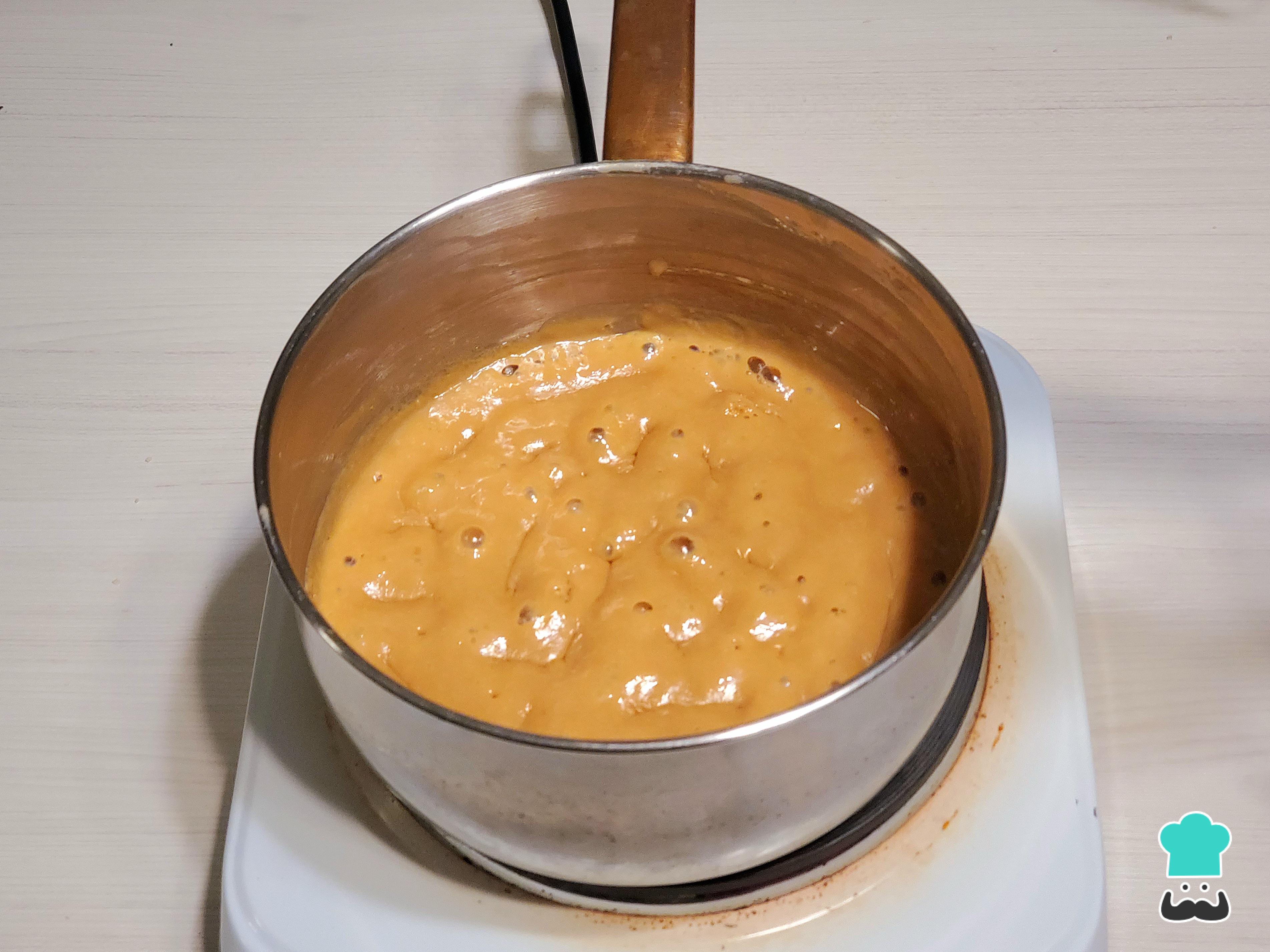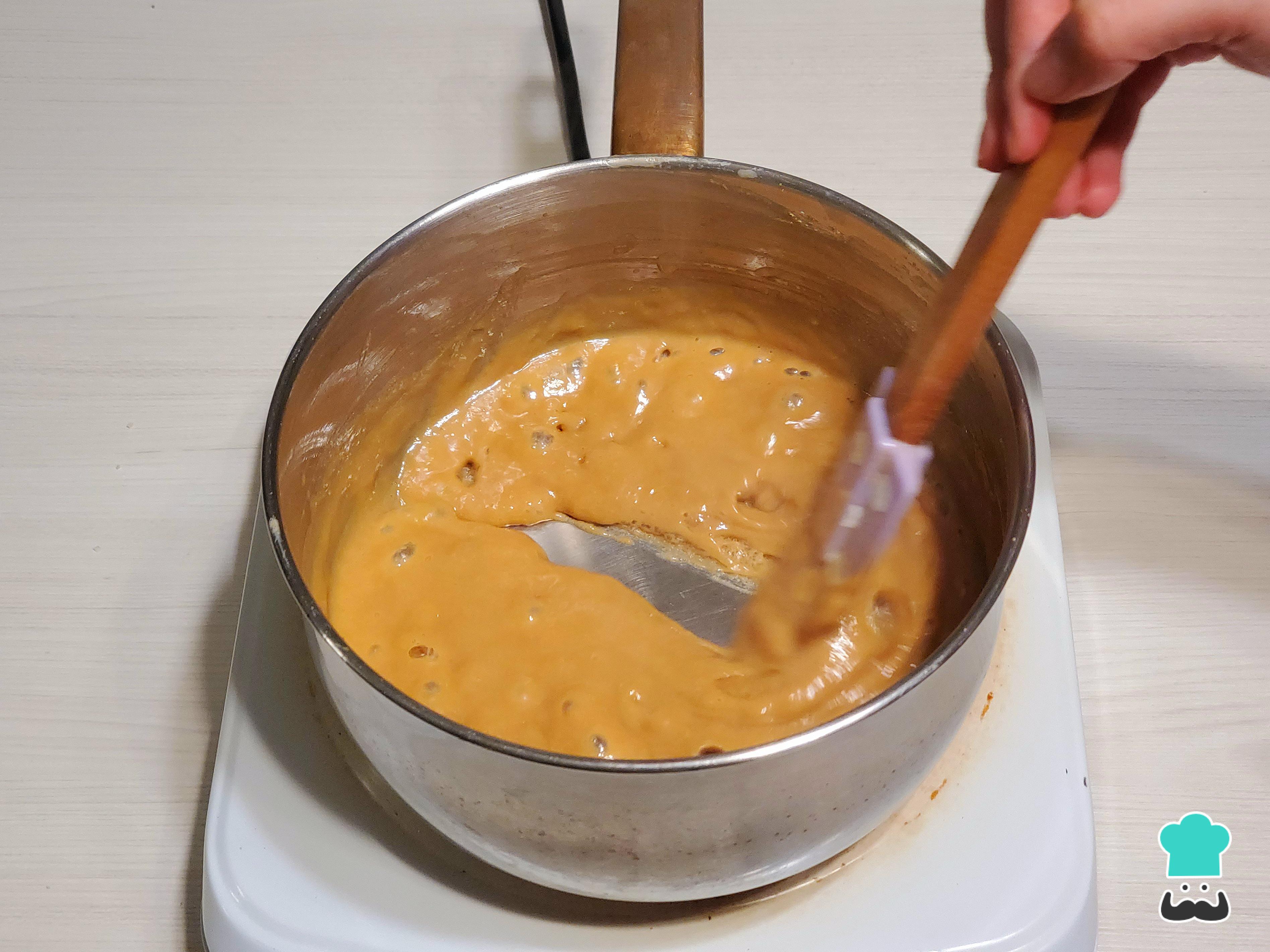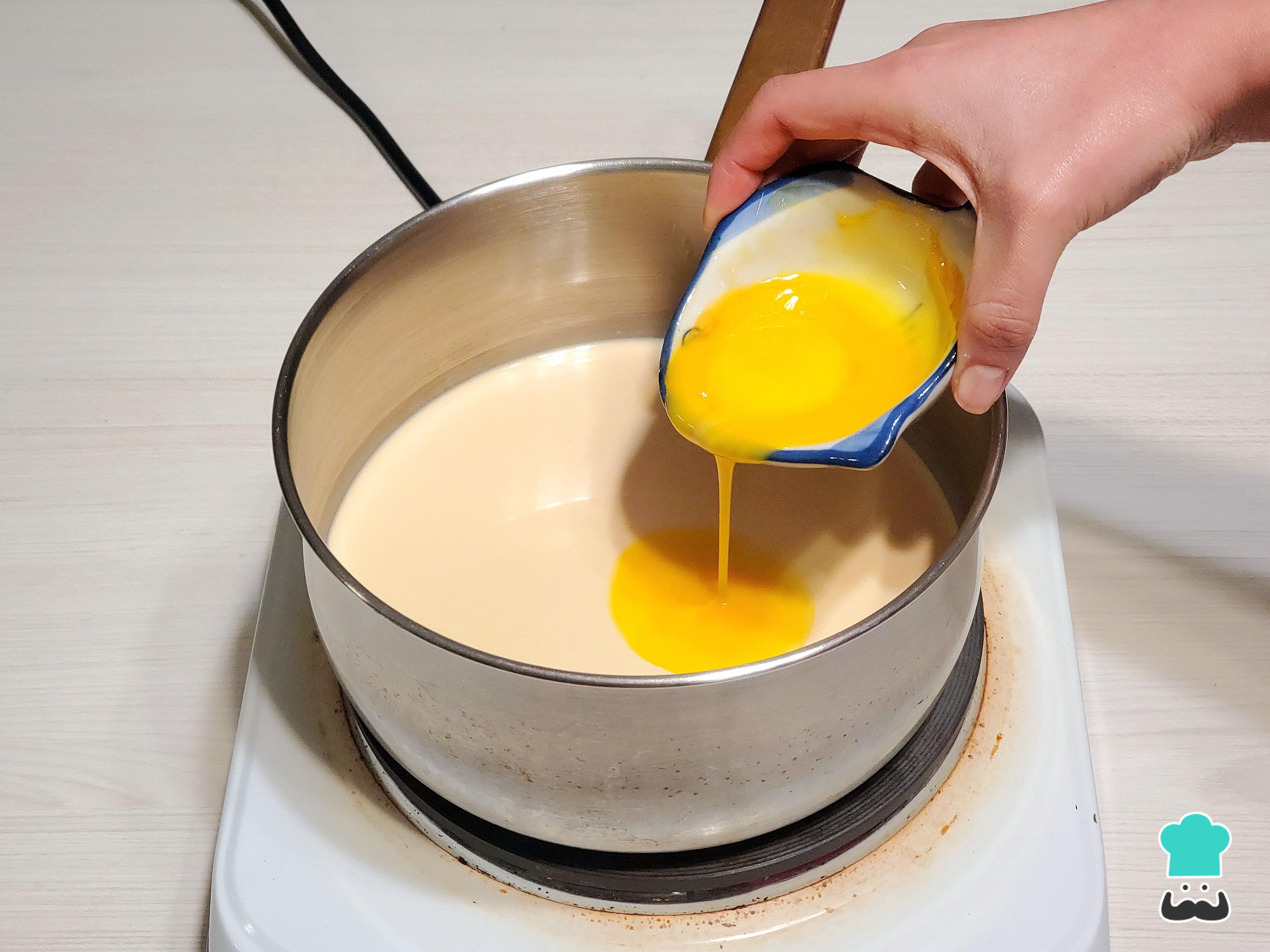 Después de unos 20 minutos, notarás que ya no rebalsa y empieza a evaporarse el líquido, obteniendo una salsa densa. Retira del fuego y vierte la mezcla colándola sobre un bowl con las yemas batidas. Cuando viertas un poco del manjar, remueve rápidamente para evitar que el huevo se coagule y vierte el resto del manjar encima. Mezcla bien hasta que veas una crema homogénea y, vuelve a colar si deseas, reserva.