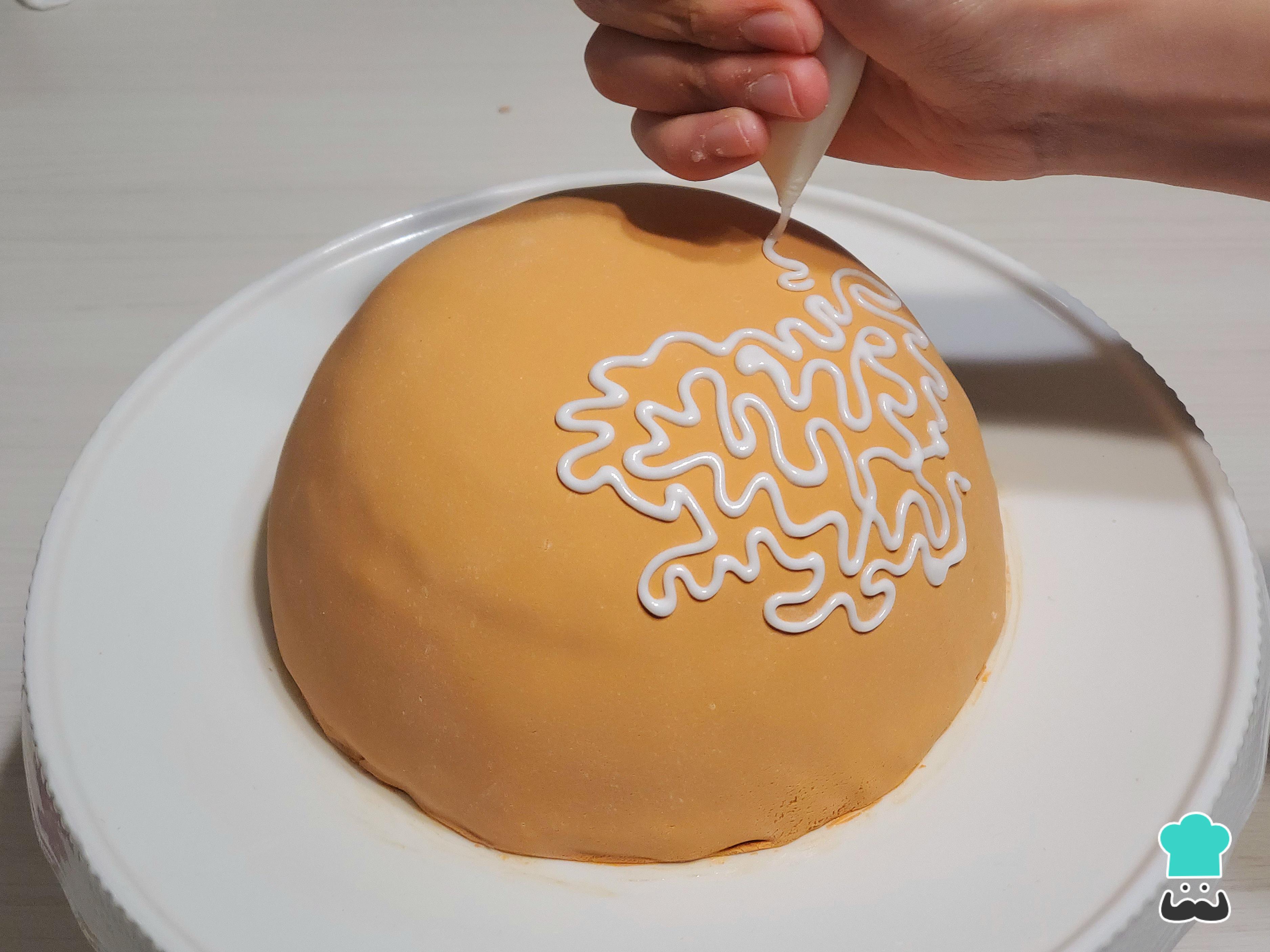 La última preparación es el glaseado real que se usa para decorar. Hacerlo es fácil: coloca la clara, el azúcar en polvo y el jugo de limón en un bowl y bátelo a máxima velocidad por aproximadamente 5 minutos. Luego, colócalo en una manga con boquilla delgada y decora la torta bola de oro haciendo un punto perdido.