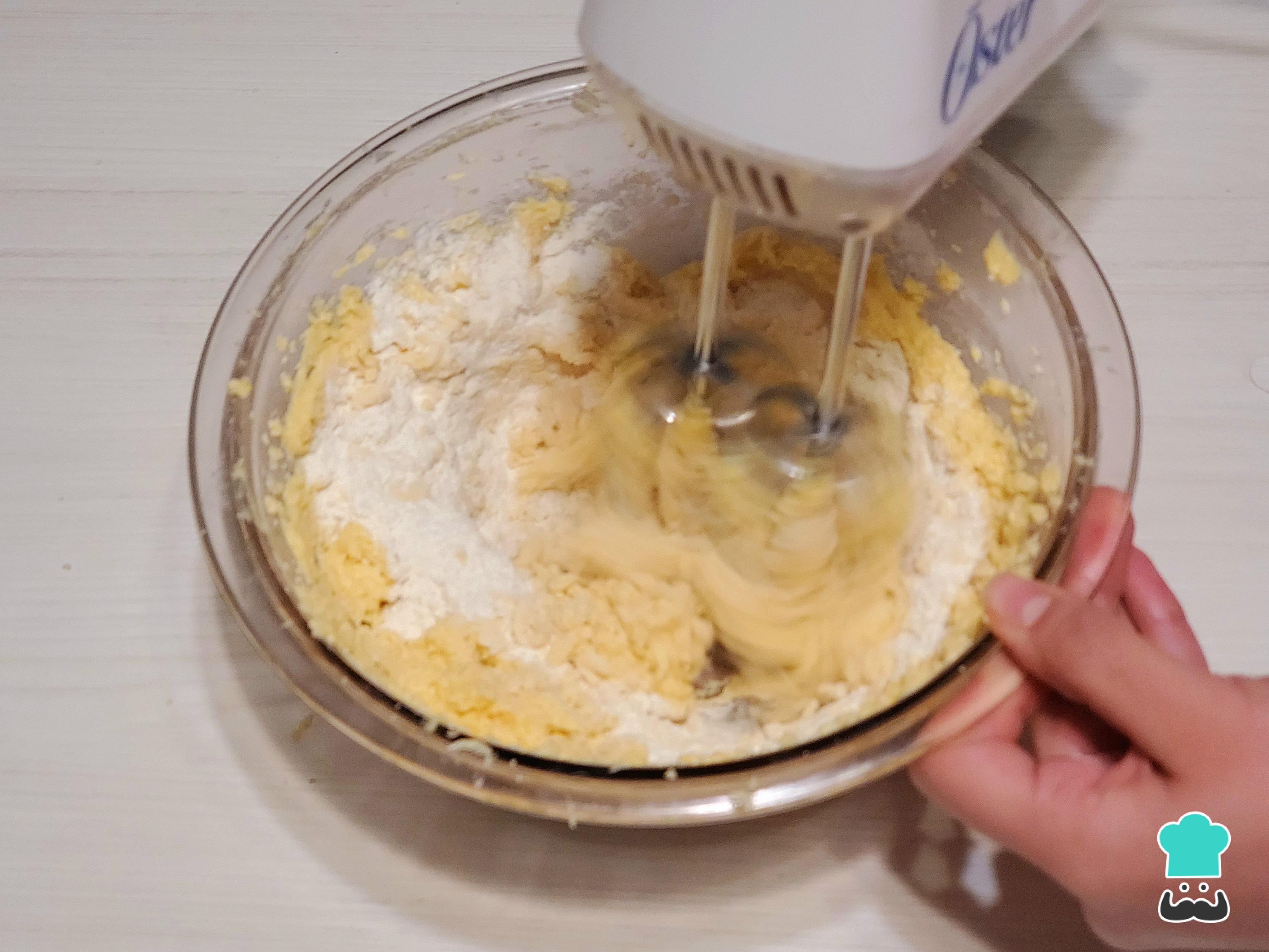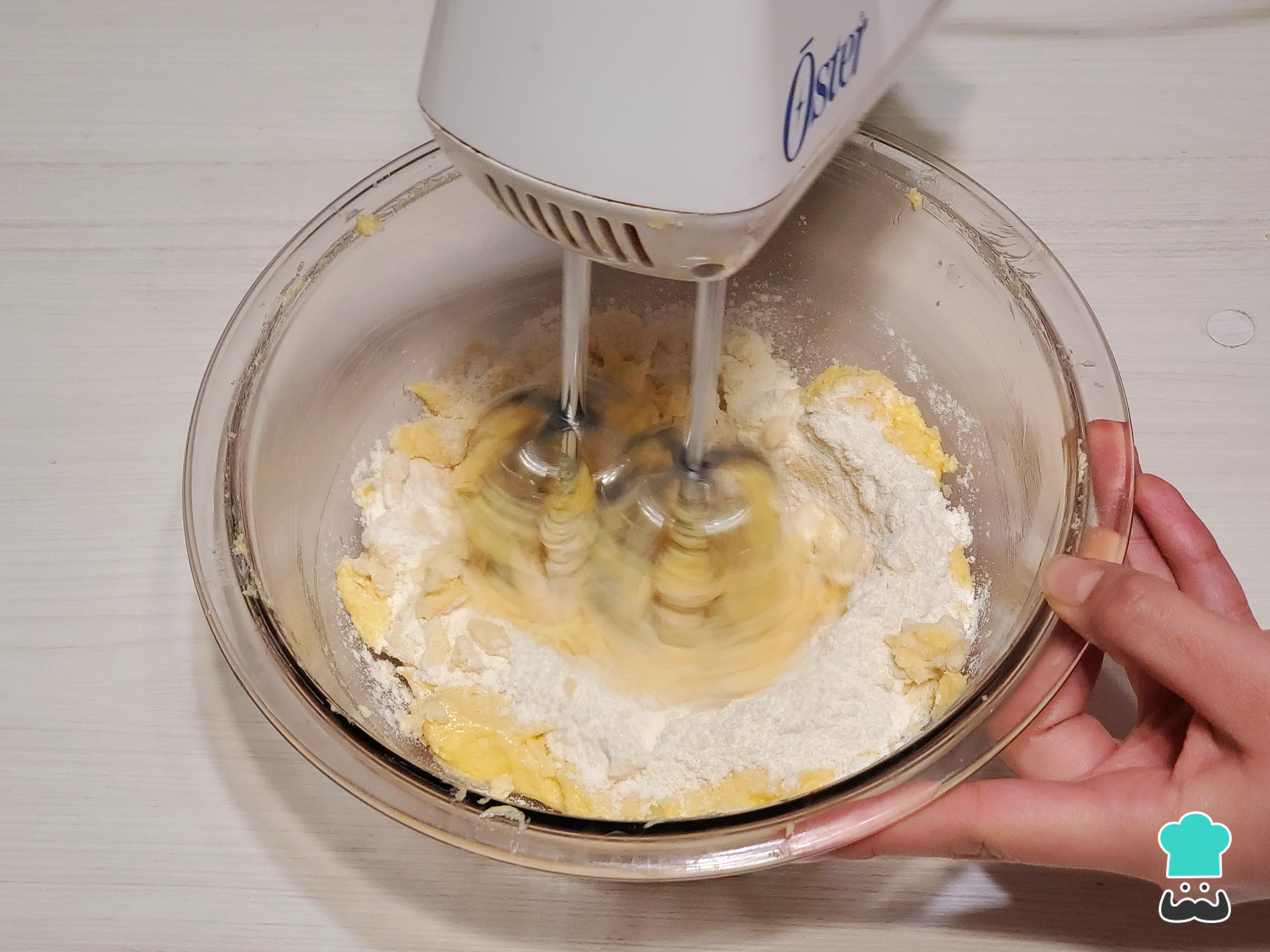Intercala los ingredientes secos con los líquidos. Es decir, vierte un tercio de la harina junto con el polvo de hornear, mezcla a velocidad baja hasta que se incorpore.