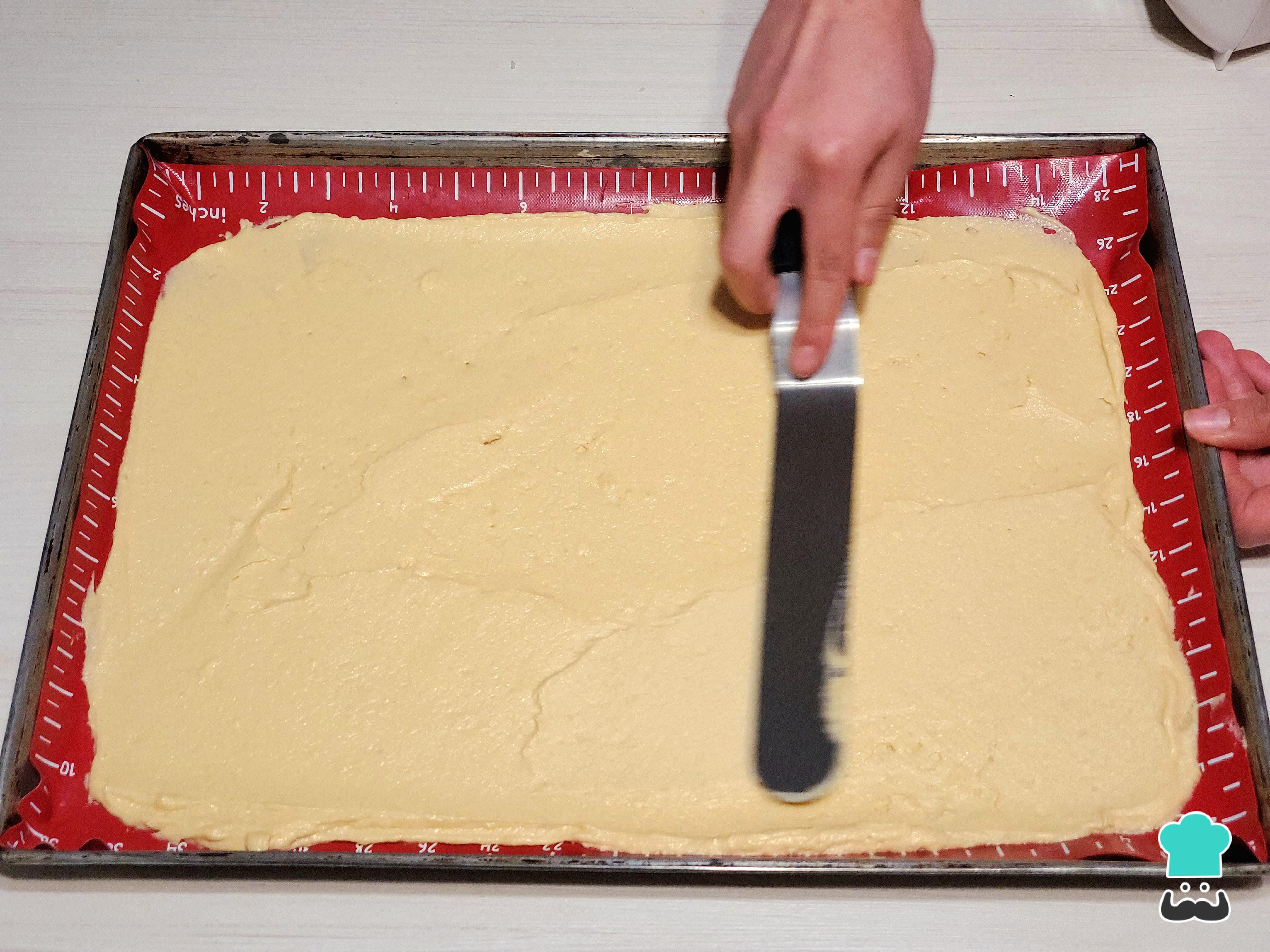 Cuando la mezcla se vea homogénea, vuélcala en dos placas con tapetes de silicona o papel manteca y hornea a 170 °C por 15 minutos o hasta que la superficie se vea dorada. Luego, retira del horno, desmolda, deja enfriar y corta en discos de diferentes tamaños.