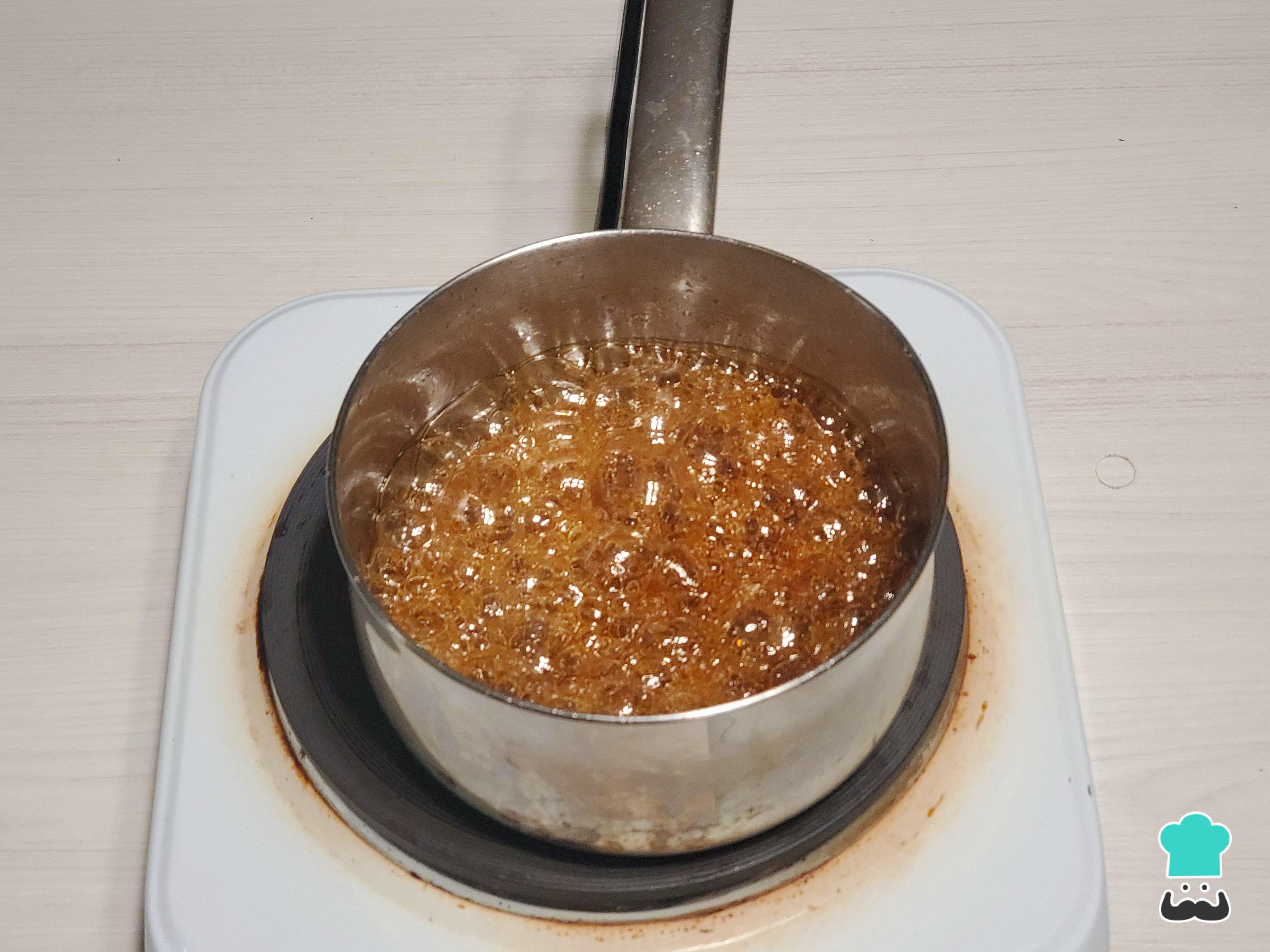 La tercera preparación es el manjar de pecanas. Hacerlo es diferente al manjar de yemas: tienes que empezar haciendo un caramelo, es decir, vierte en una olla el azúcar y cubre con agua.
