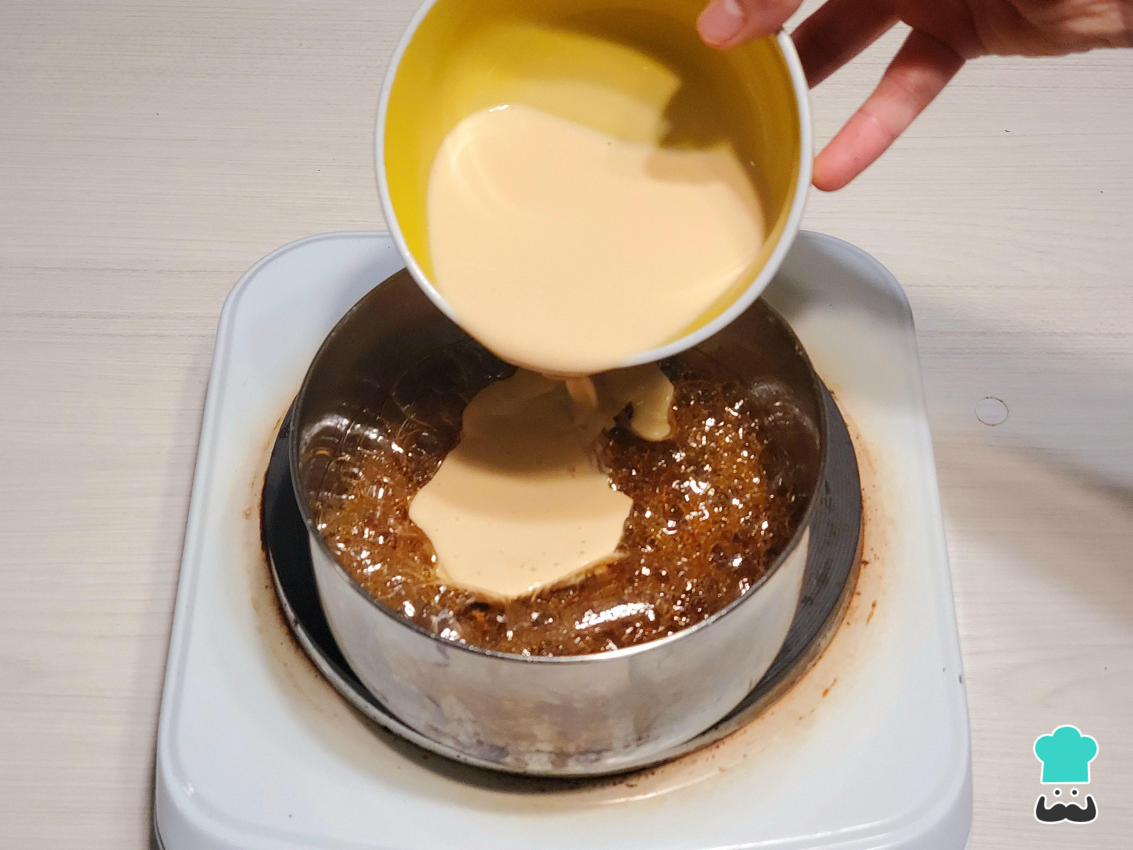 La segunda preparación es el manjar de yemas. Comienza vertiendo en una olla la leche evaporada junto con la leche condensada y, si quieres aromatizar, unas gotas de esencia de vainilla o una rama de canela. Deja que hierva removiendo esporádicamente y teniendo cuidado de que no rebalse.