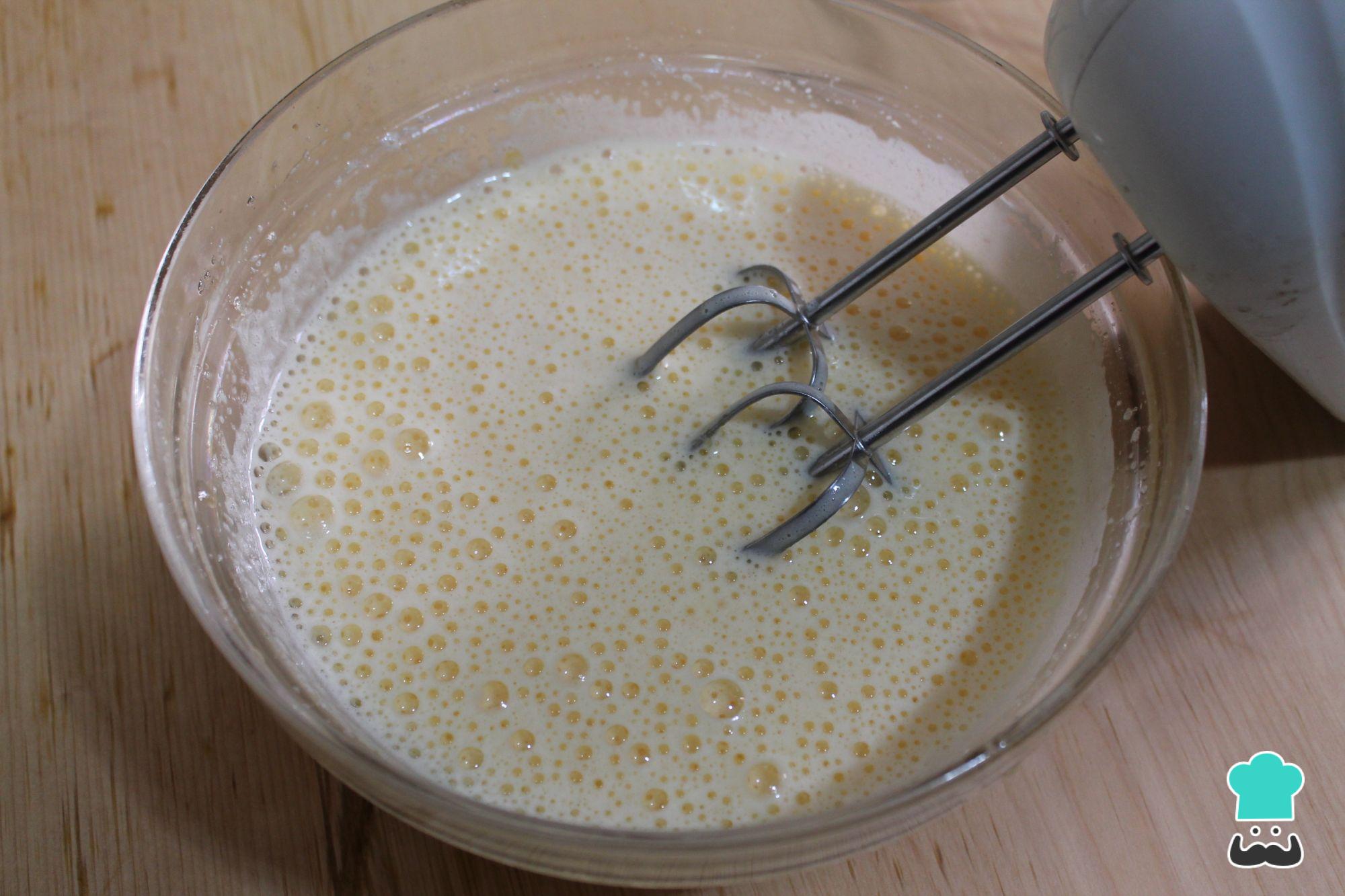 Casca en un bol los huevos junto con el azúcar y bate con unas varillas eléctricas hasta que la mezcla quede blanquecina y esponjosa.