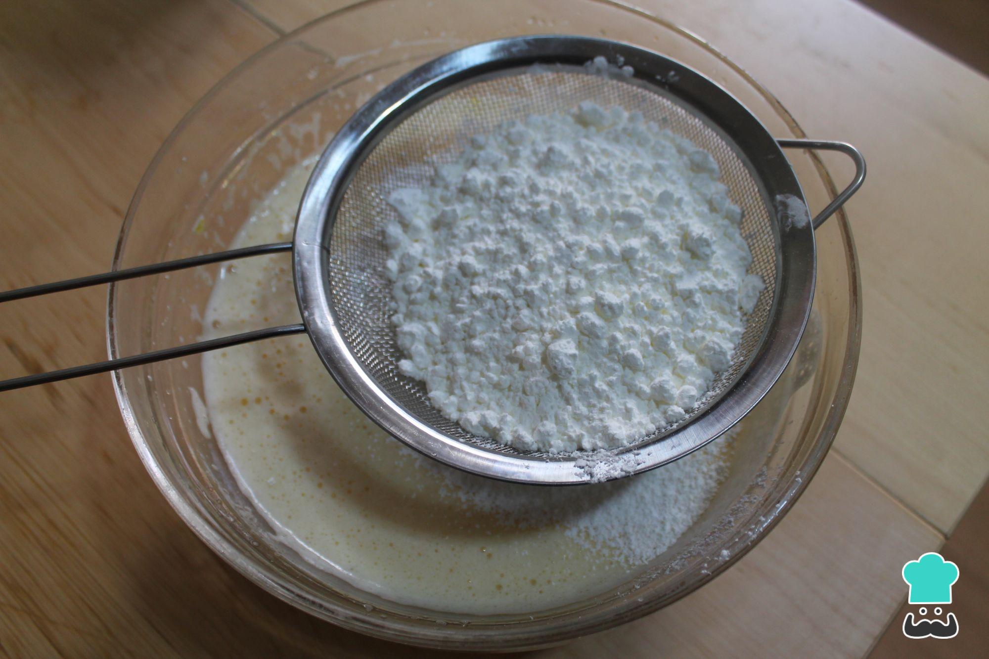 Mezcla la levadura química con la maicena y tamiza encima de la mezcla de huevos y azúcar. Bate en esta ocasión con unas varillas manuales con movimientos envolventes.