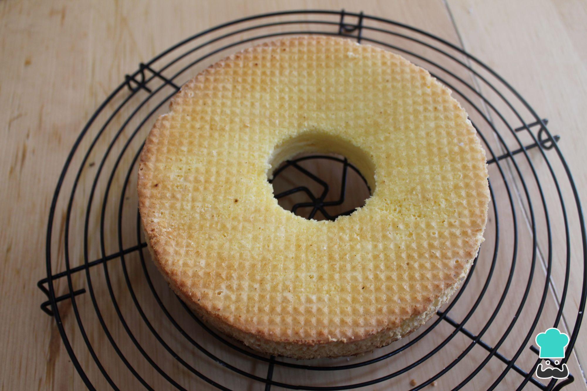 Retira el molde del horno y dale un golpe seco en una superficie plana para que no se baje. Pasa un cuchillo afilado por los bordes del bizcocho y desmolda con cuidado en una rejilla para que se enfríe.