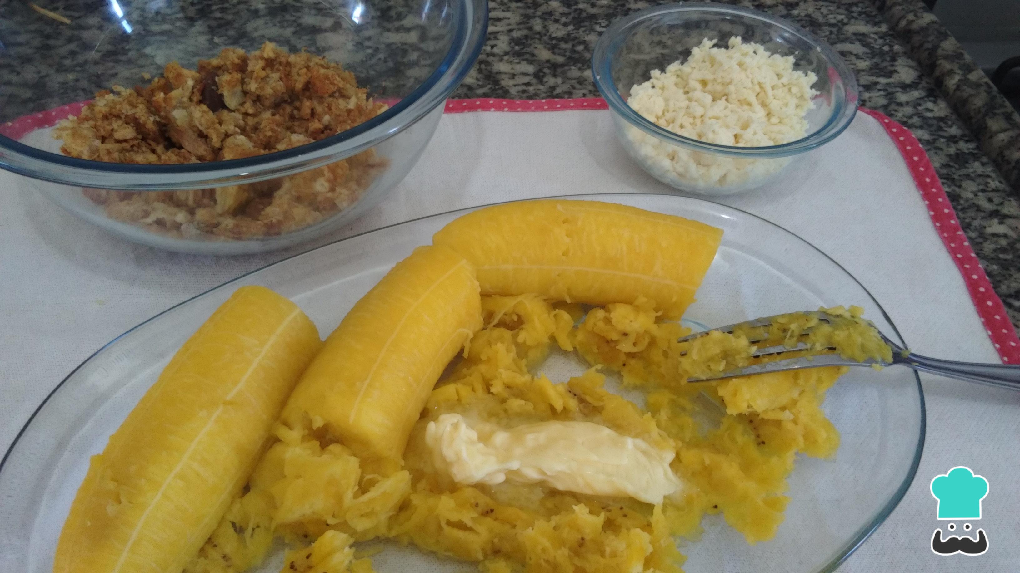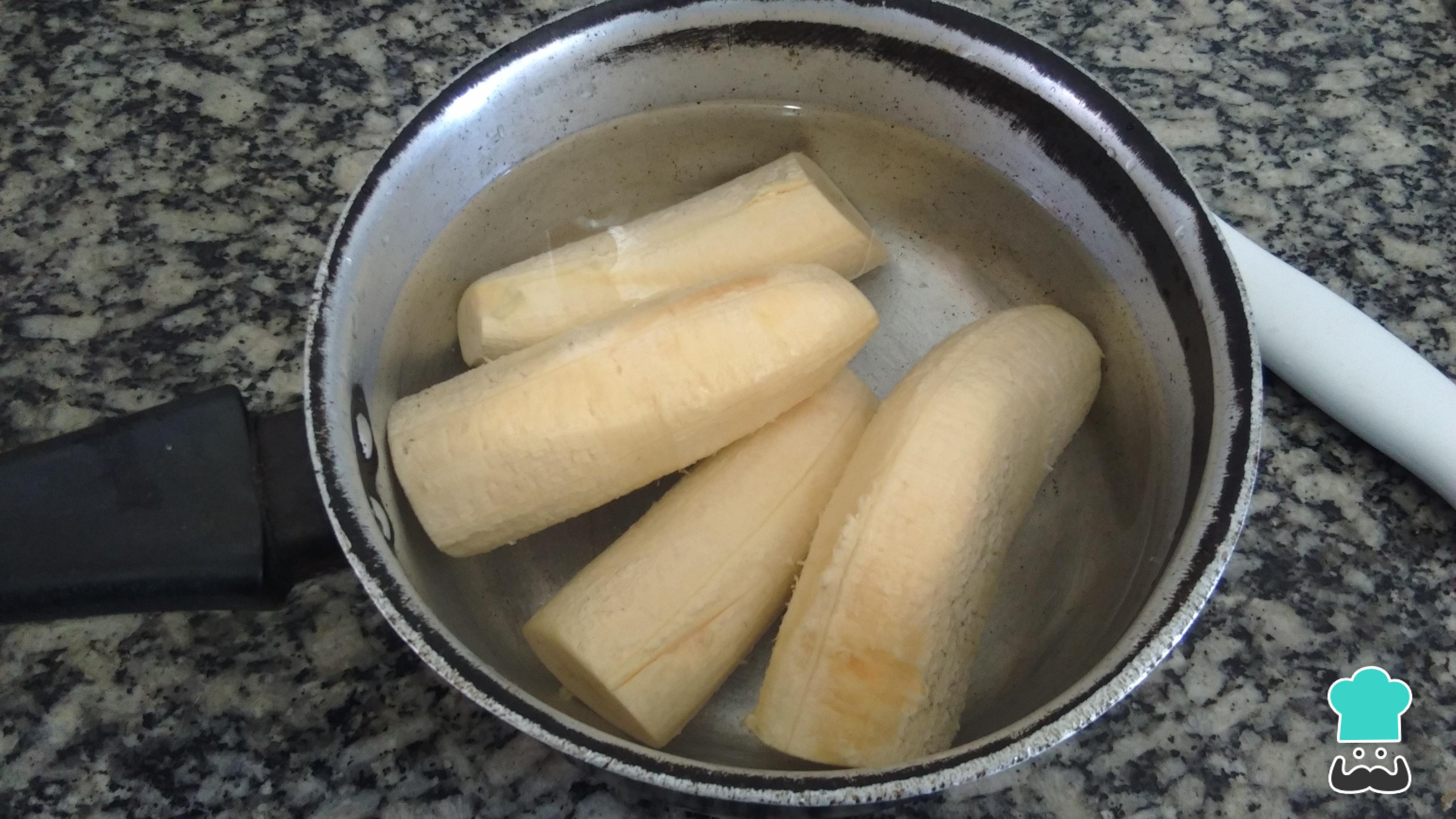 Tal como en otras recetas ecuatorianas, el plátano macho, o plátano a secas, es el ingrediente principal. Retira la cáscara y pícalos en dos.