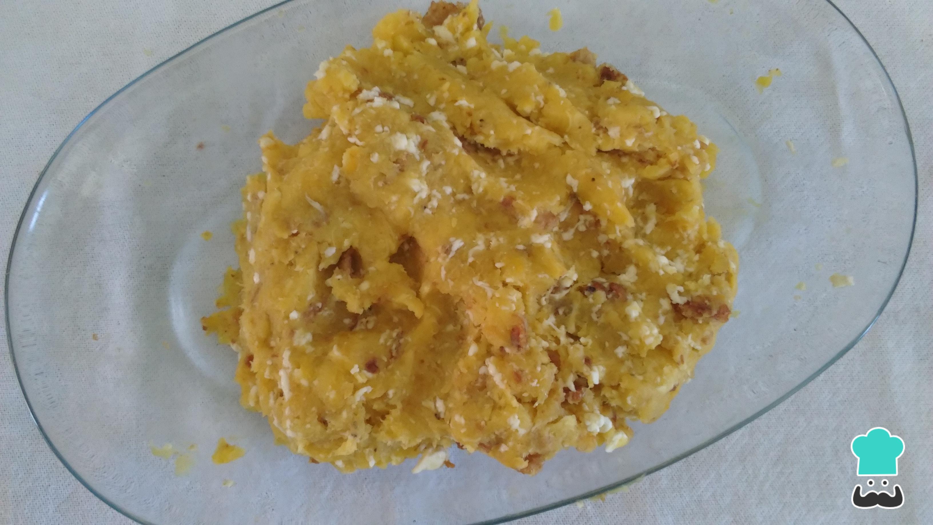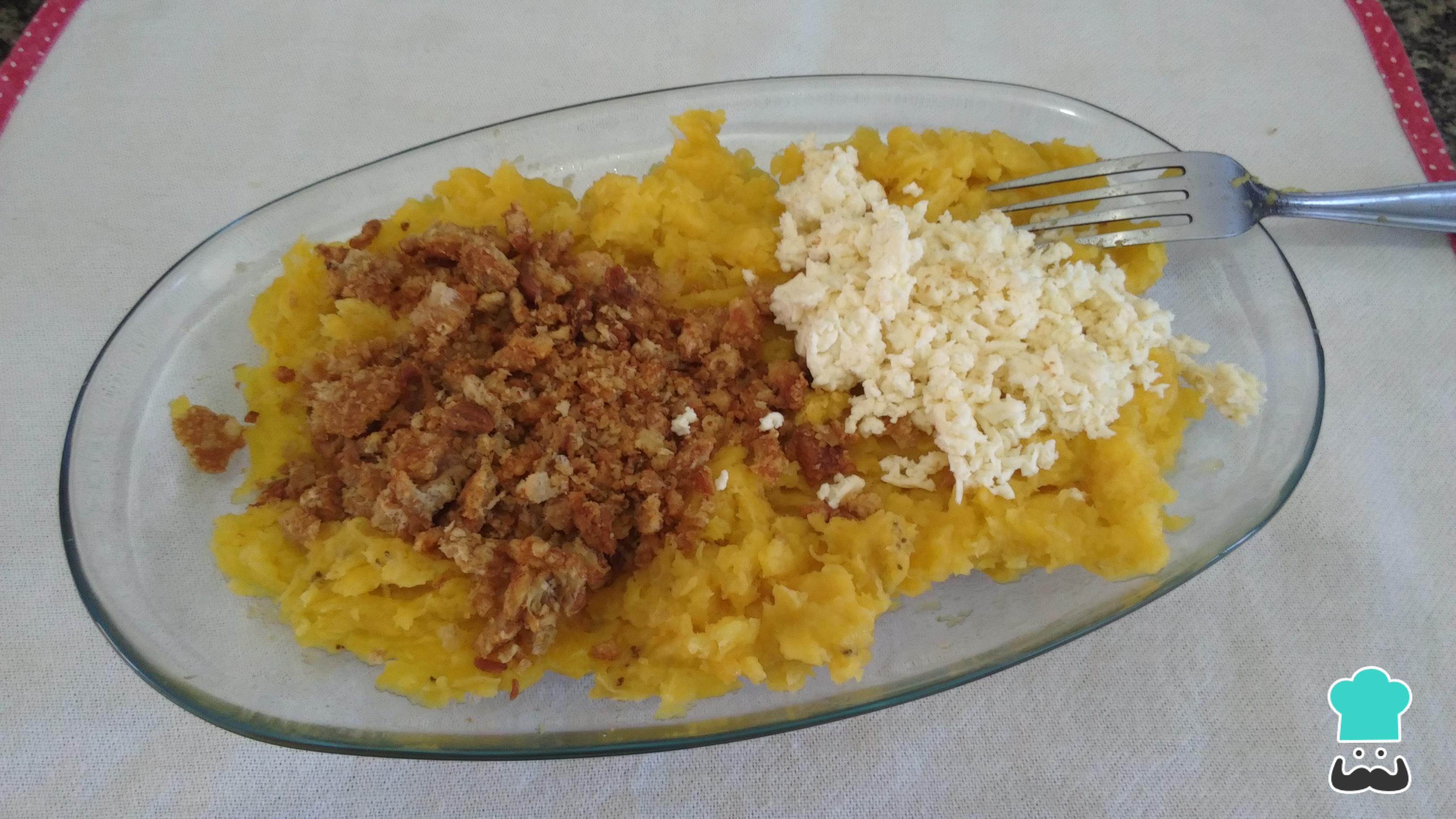 Cuando esté aún tibio, al menos lo suficiente para manejarlo con las manos, agrega el chicharrón picado finamente o molido y el queso rallado grueso.