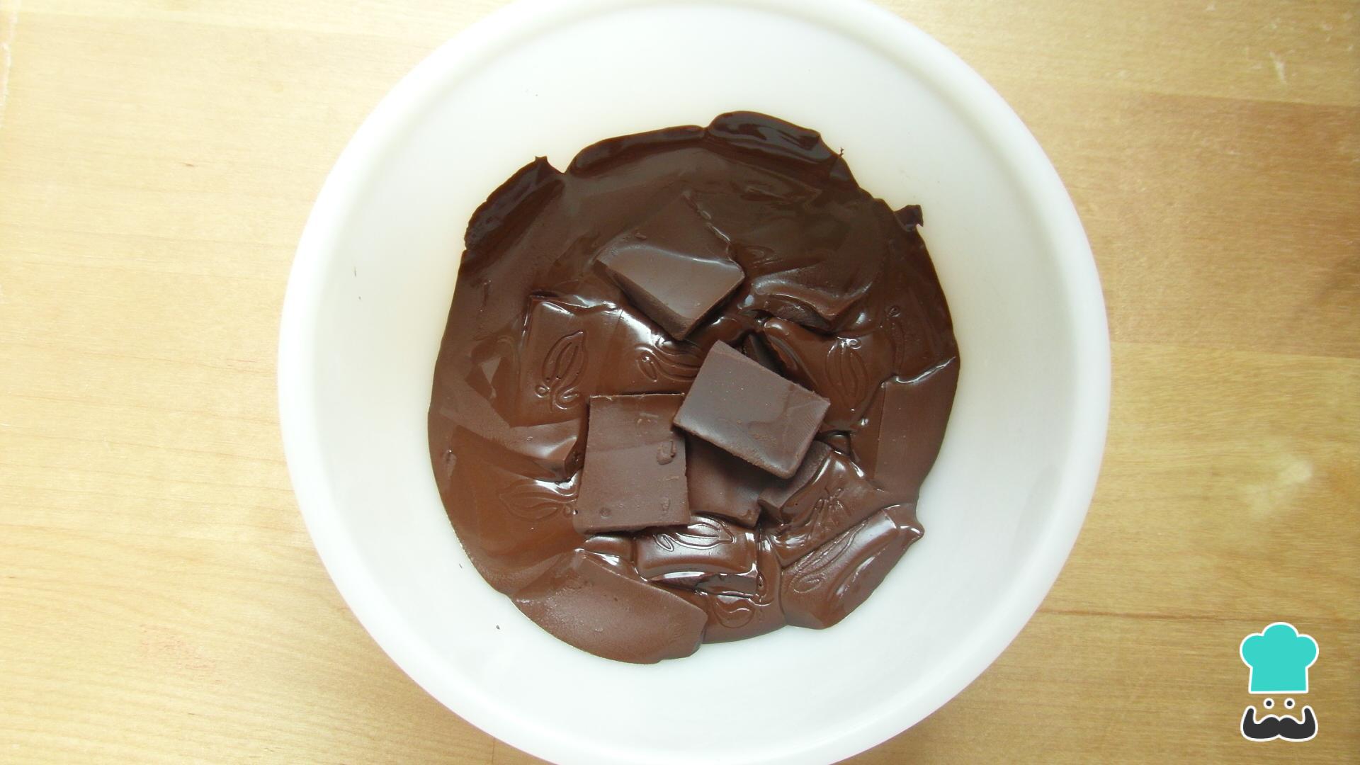 Trocea el chocolate en trozos y derrítelo en el microondas a máxima potencia durante 30 segundos. Luego sácalo, remueve un poco y repite el mismo paso hasta que se derrita completamente.