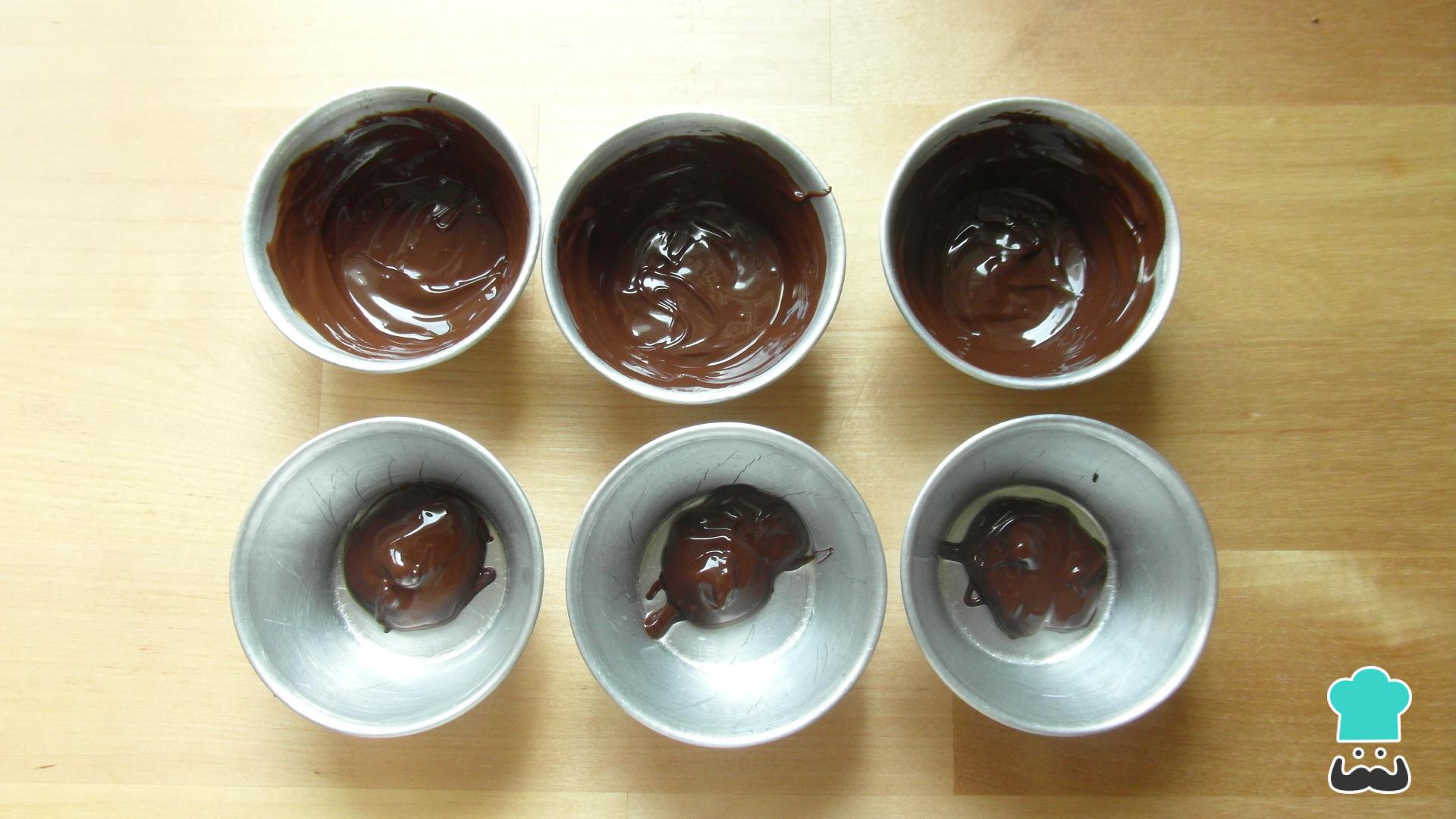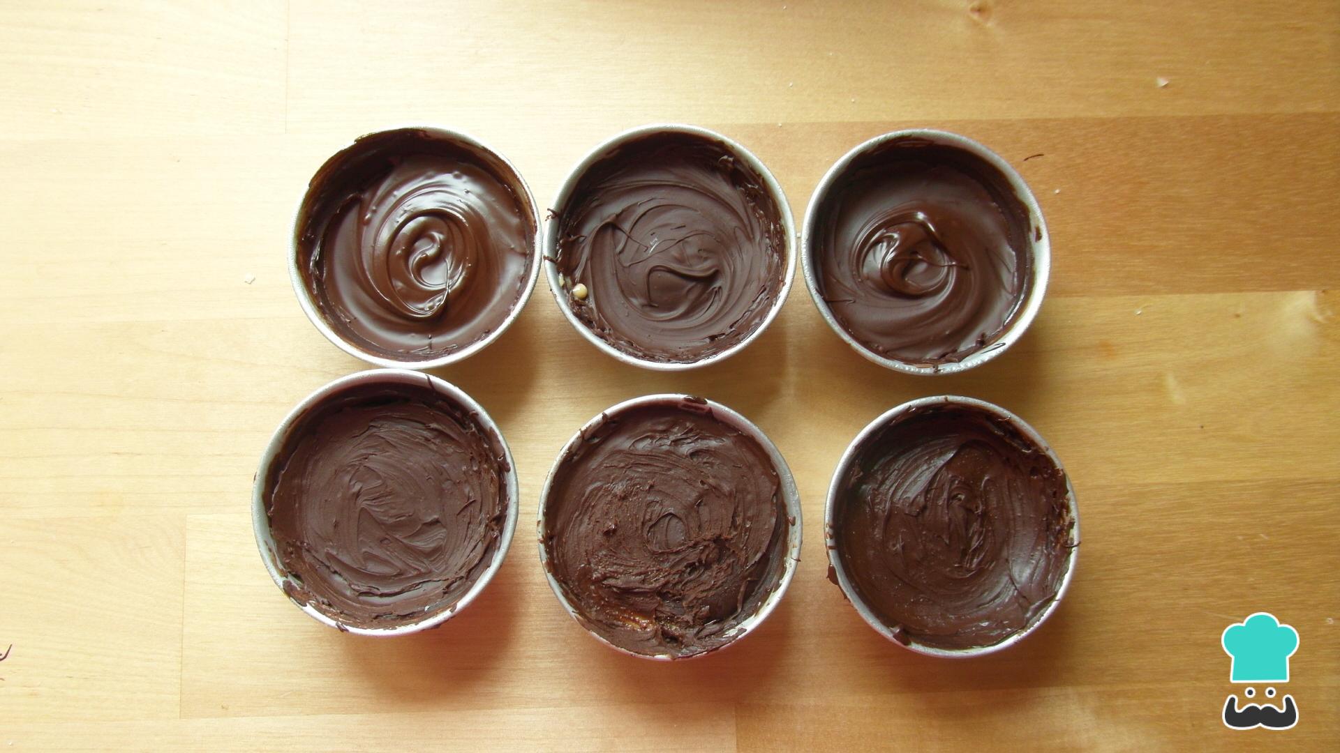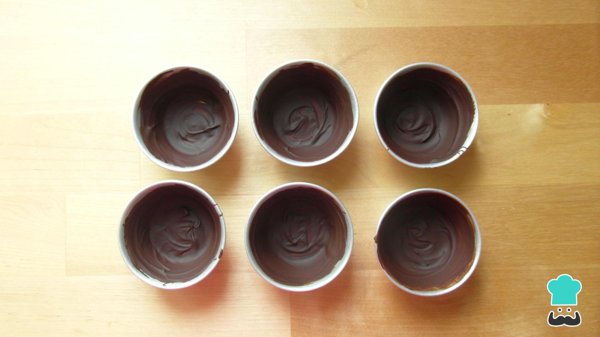 Unta los moldes que prefieras con un poco del chocolate derretido, solo para que se forme una especie de corteza.