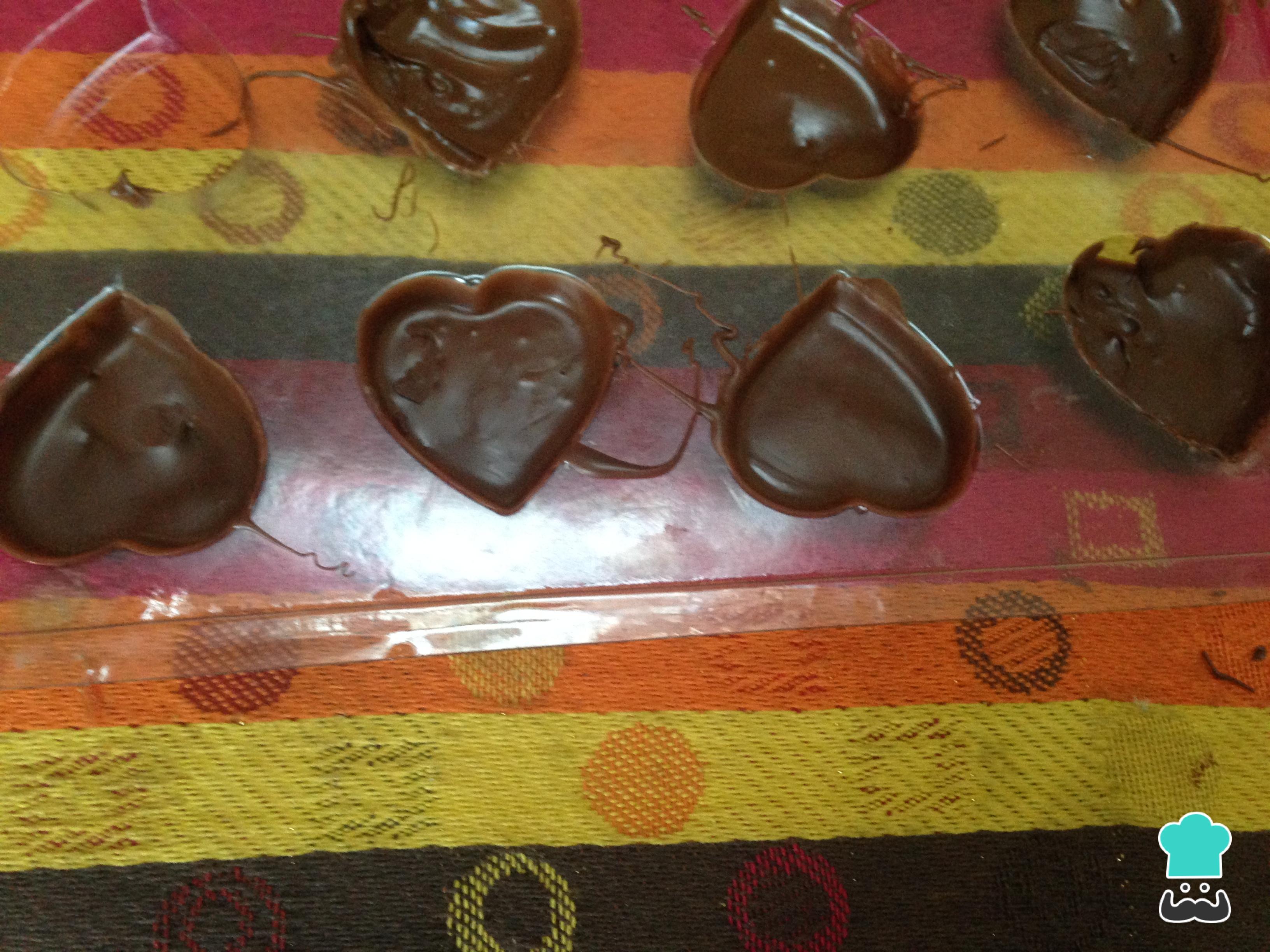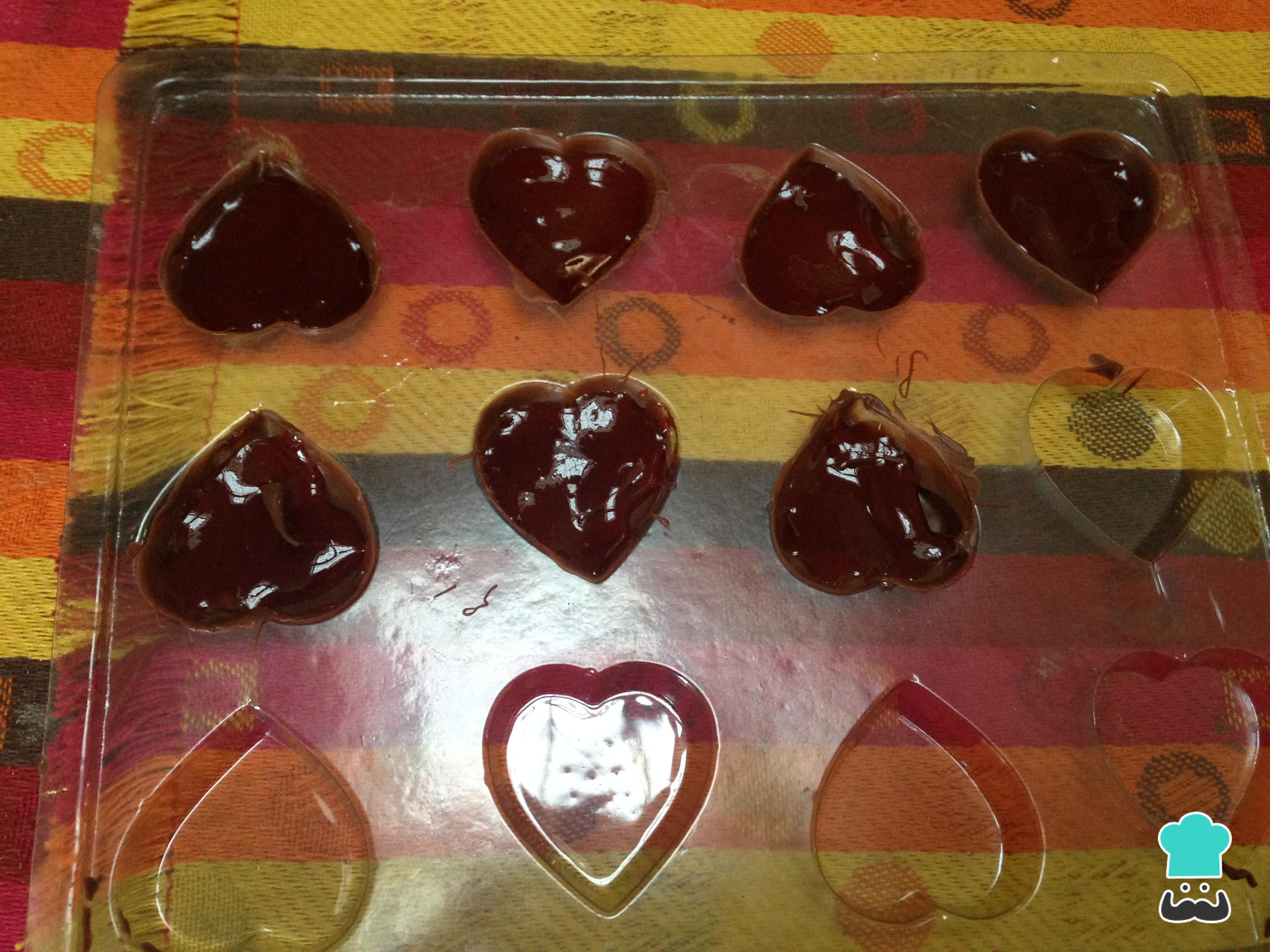 Agregar chocolate en el moldo cubriendo muy bien cada corazón, retirar el exceso.