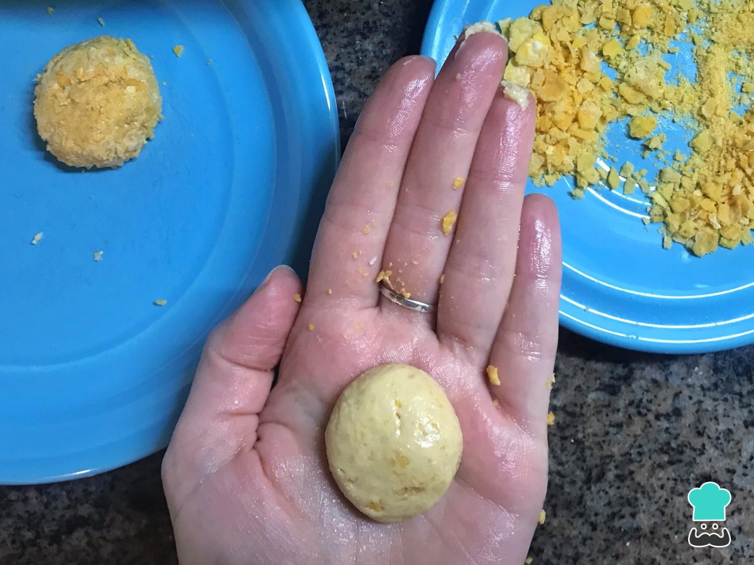 Con las manos un poco húmedas para que no se peguen, arma pelotitas del mismo tamaño y rebózalas con los cereales o las galletas de arroz picadas. Refrigéralas aproximadamente 5 minutos para que puedas continuar con el siguiente paso sin complicaciones.