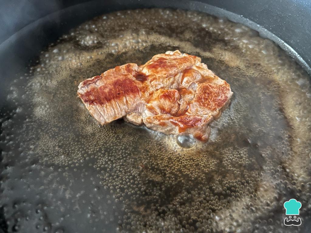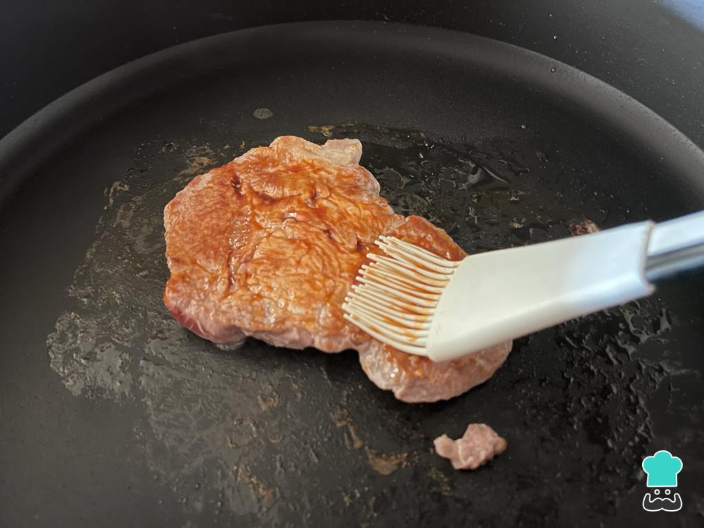 Cuando hayas dado la vuelta a la carne, píntala con la salsa barbacoa. Si deseas preparar tu salsa barbacoa de forma casera, entonces no dejes de visitar la receta de salsa barbacoa, donde enseñamos a hacerla paso a paso.