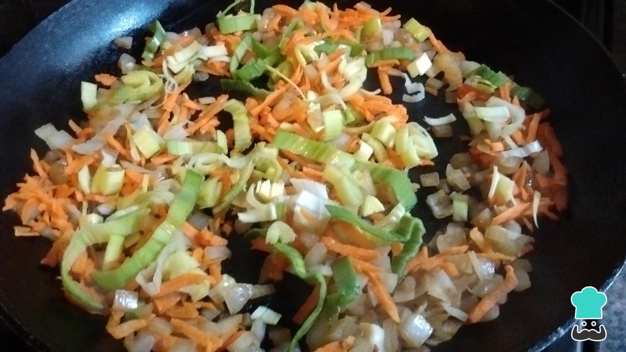 Para empezar con la preparación de la bondiola desmenuzada, pela y pica la cebolla, el puerro y la zanahoria. Saltea los vegetales en una sartén antiadherente bien caliente con una cucharadita de aceite. Si el salteado está secándose, puedes agregar 1 cucharada de agua caliente para levantar el fondo de cocción. Repite un par de veces hasta que estén ligeramente dorados.