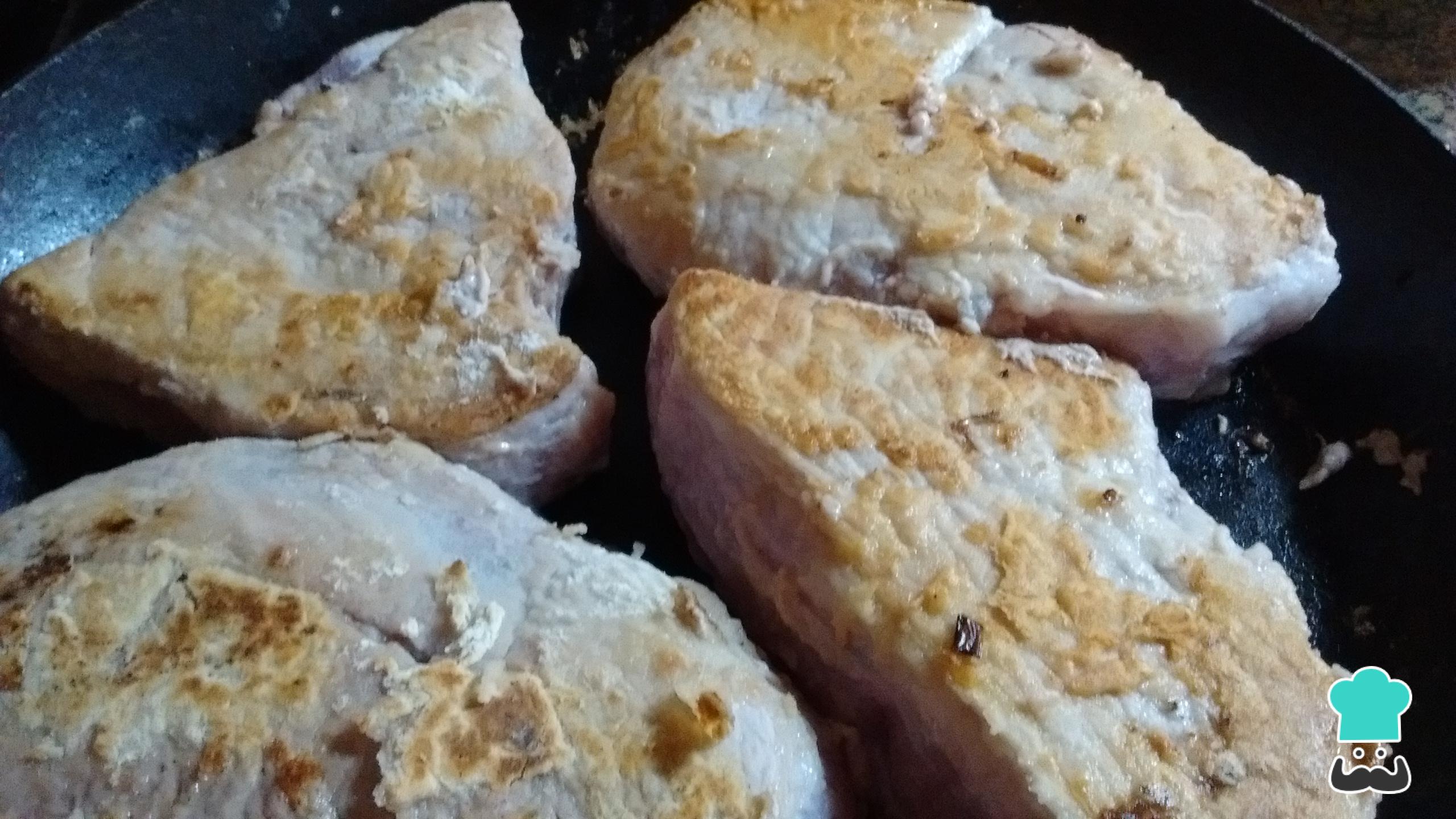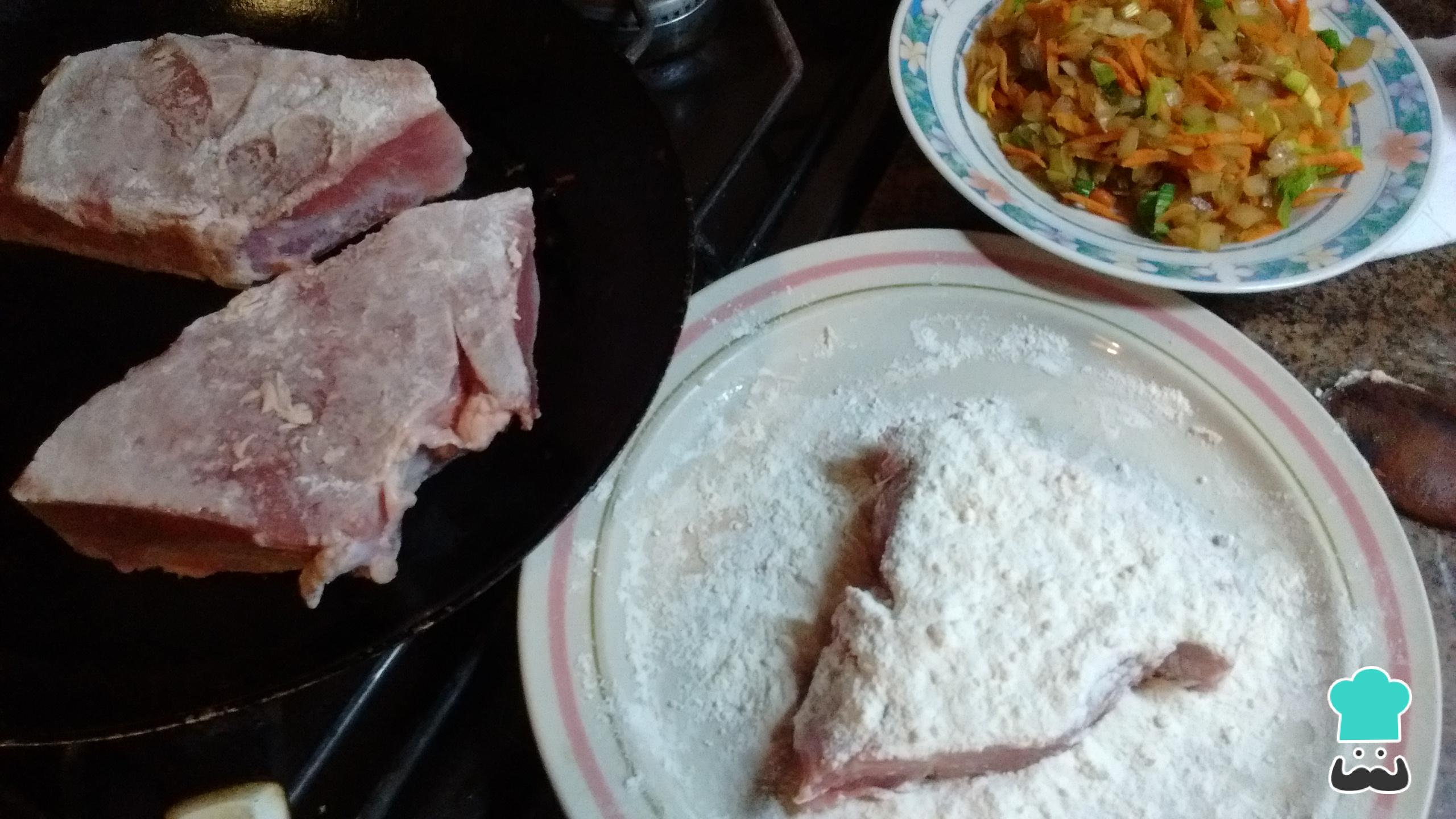 Cuando los vegetales estén dorados, agrega una cucharada de agua caliente y, antes que se evapore, retíralos y disponlos en un plato para usarlos luego. En el mismo fondo de cocción, dora por ambos lados las rodajas de bondiola, previamente rebozada en harina. Esto proporcionará un gran sabor por el grillado, guardará los jugos dentro de la carne y aportará consistencia cremosa al fondo de cocción. Es un paso clave para la bondiola desmenuzada.