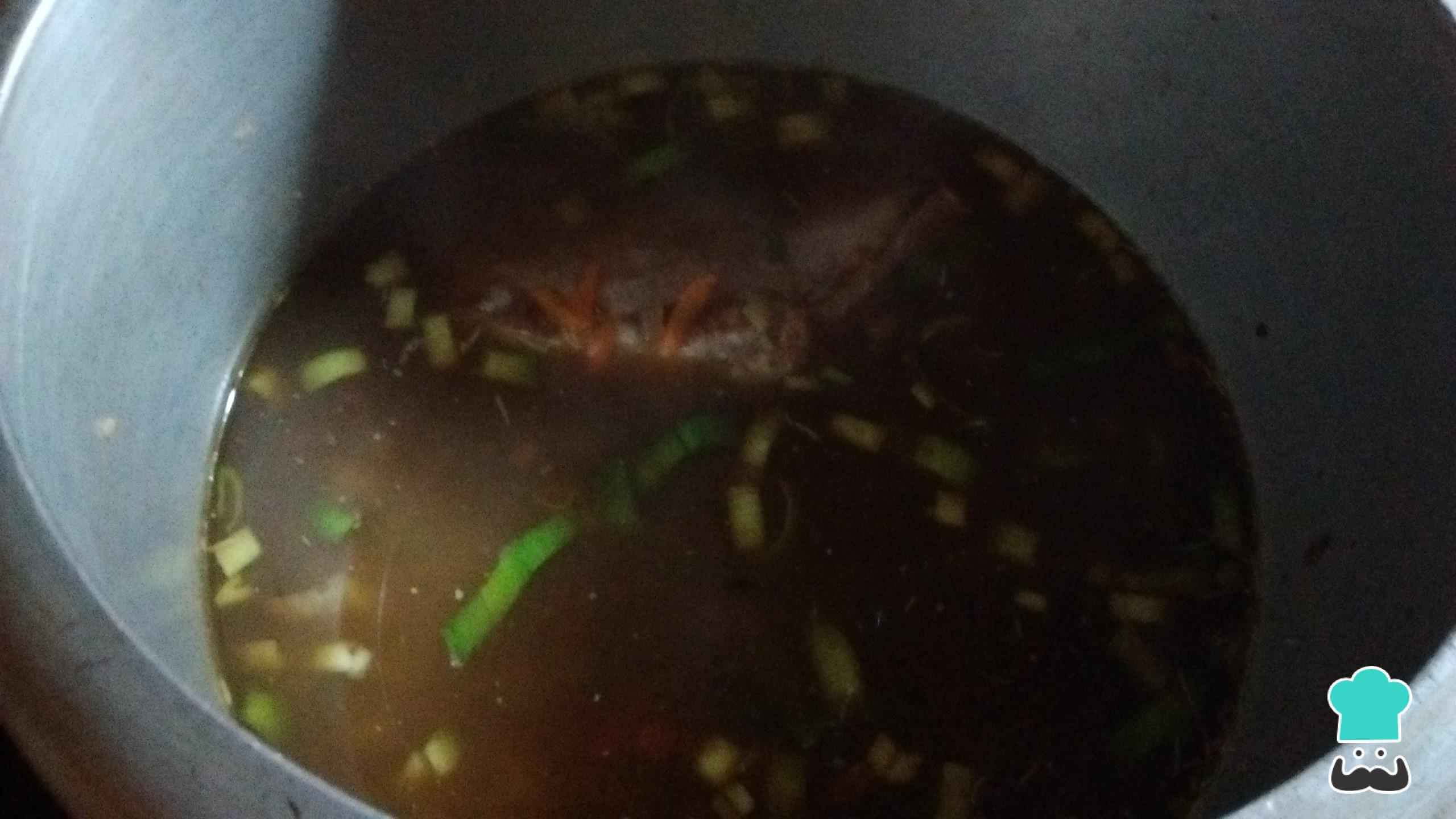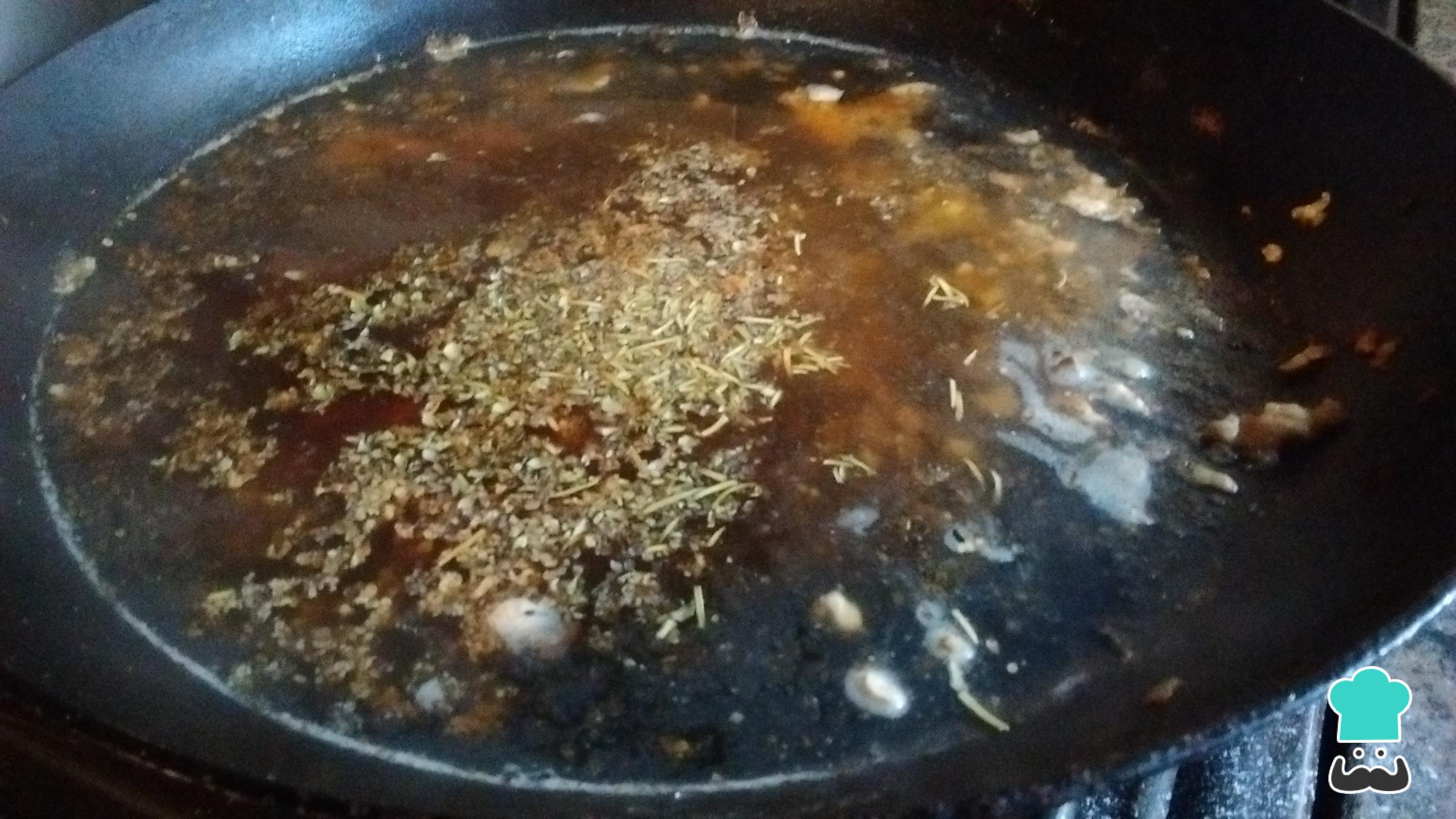 Retira la bondiola y agrega un vaso de agua caliente junto con los condimentos. Puedes eliminar o reemplazar los condimentos al gusto, en este caso, hemos utilizado romero, tomillo, provenzal, semillas de mostaza molidas, ají molido, miel y canela. Reserva hasta que el agua hierva y revuelve para levantar el fondo del salteado de vegetales y el sellado de la carne.