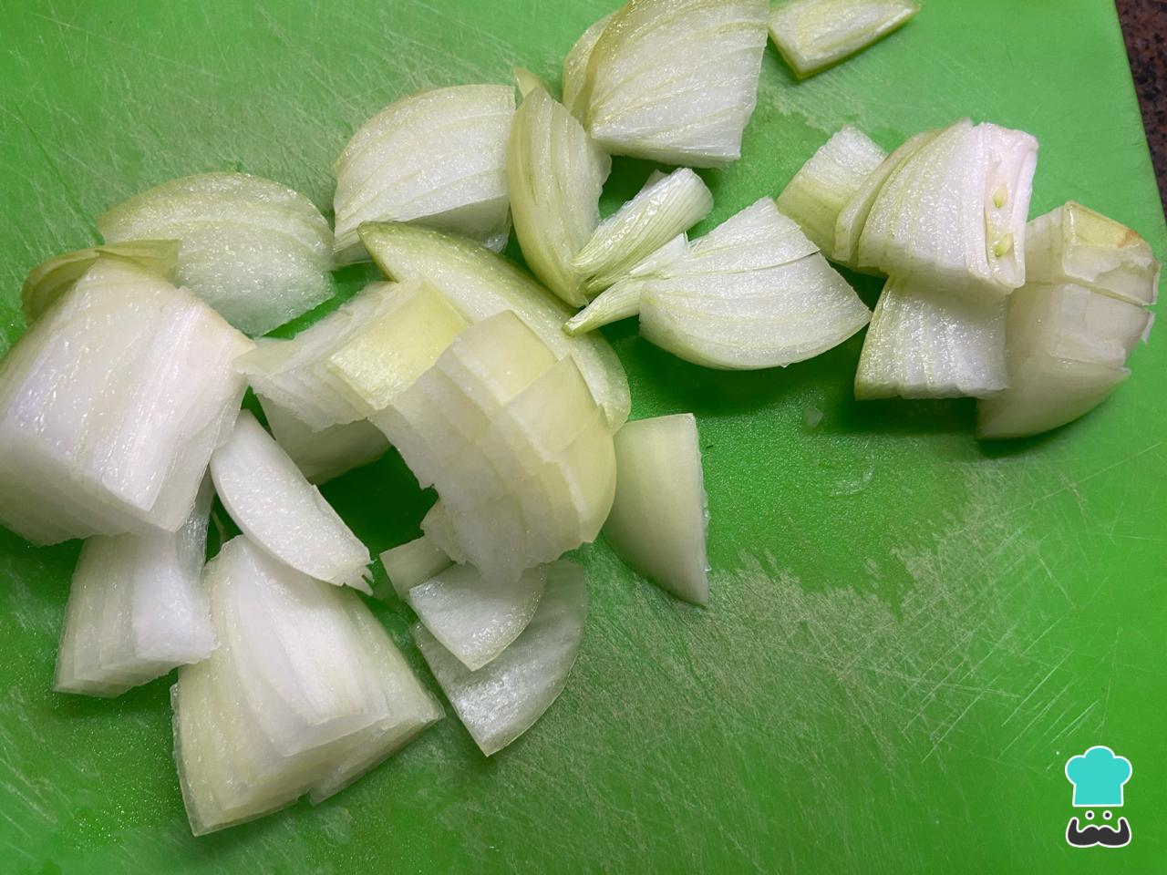 Pela la cebolla y córtala en trozos. Para esta receta es recomendable no cortar los vegetales demasiado pequeños para que no se deshagan durante la cocción larga.
