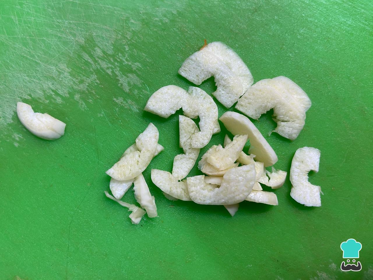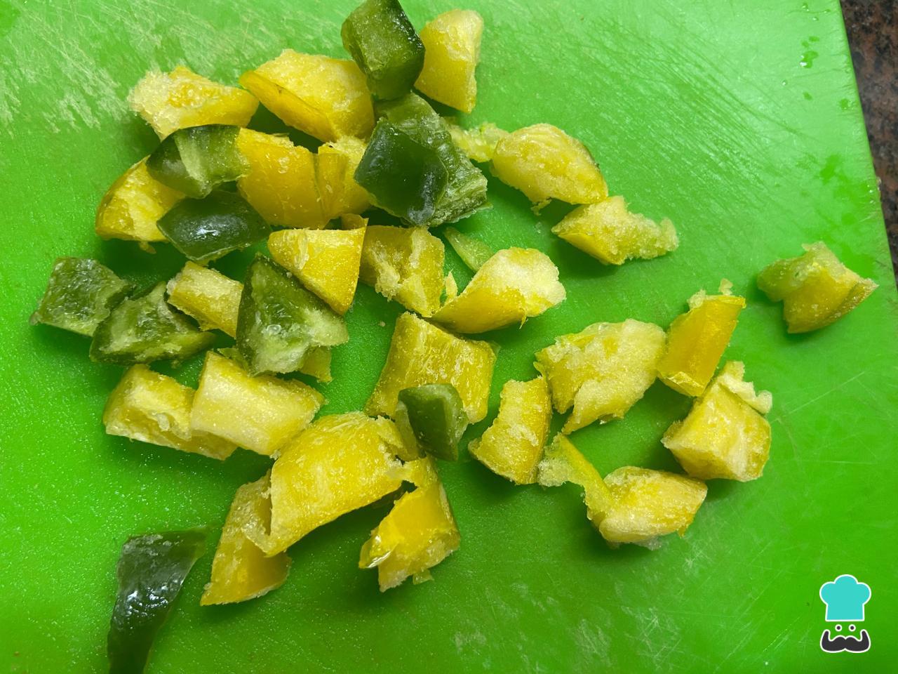 También retira las semillas y nervaduras del pimiento y corta en cubos. En este caso utilizamos un mix de pimientos verdes y amarillos, pero puedes utilizar el que más te guste.