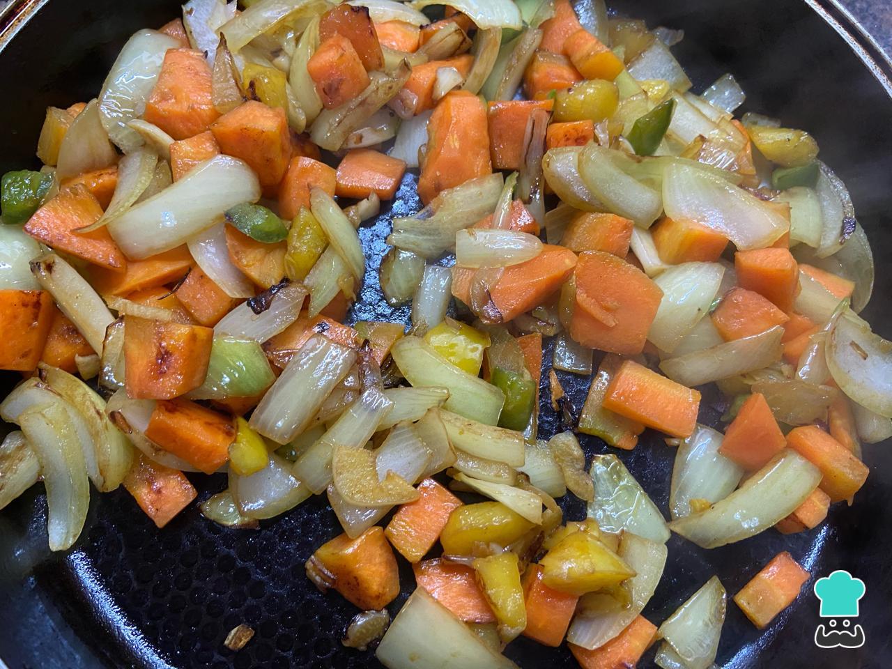 Retira y coloca en la misma sartén todos los vegetales. Deja cocinar unos minutos hasta que empiecen a dorarse.