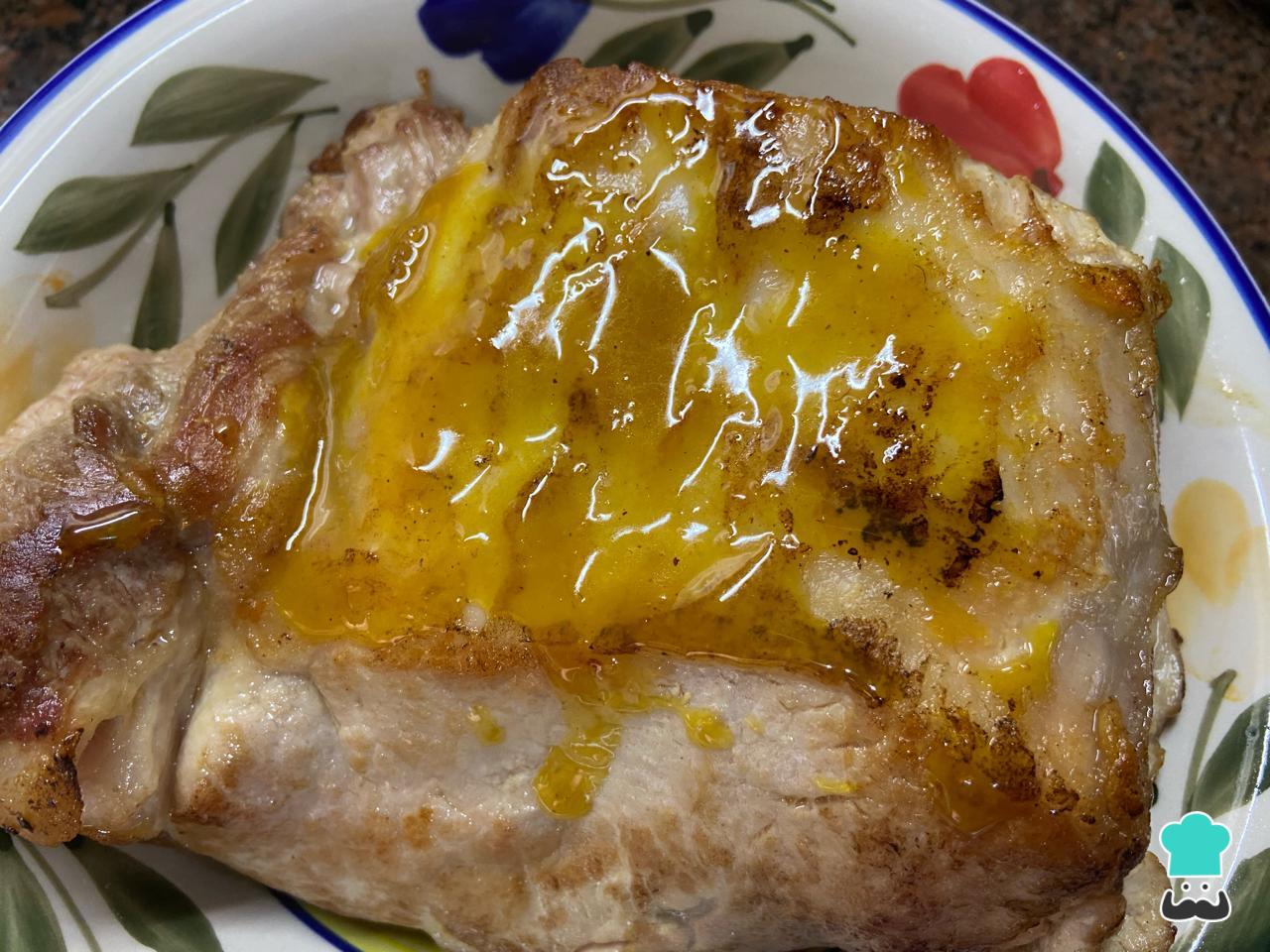 Mientras tanto, mezcla en un bol la mostaza con la miel y unta la bondiola con esa salsa.