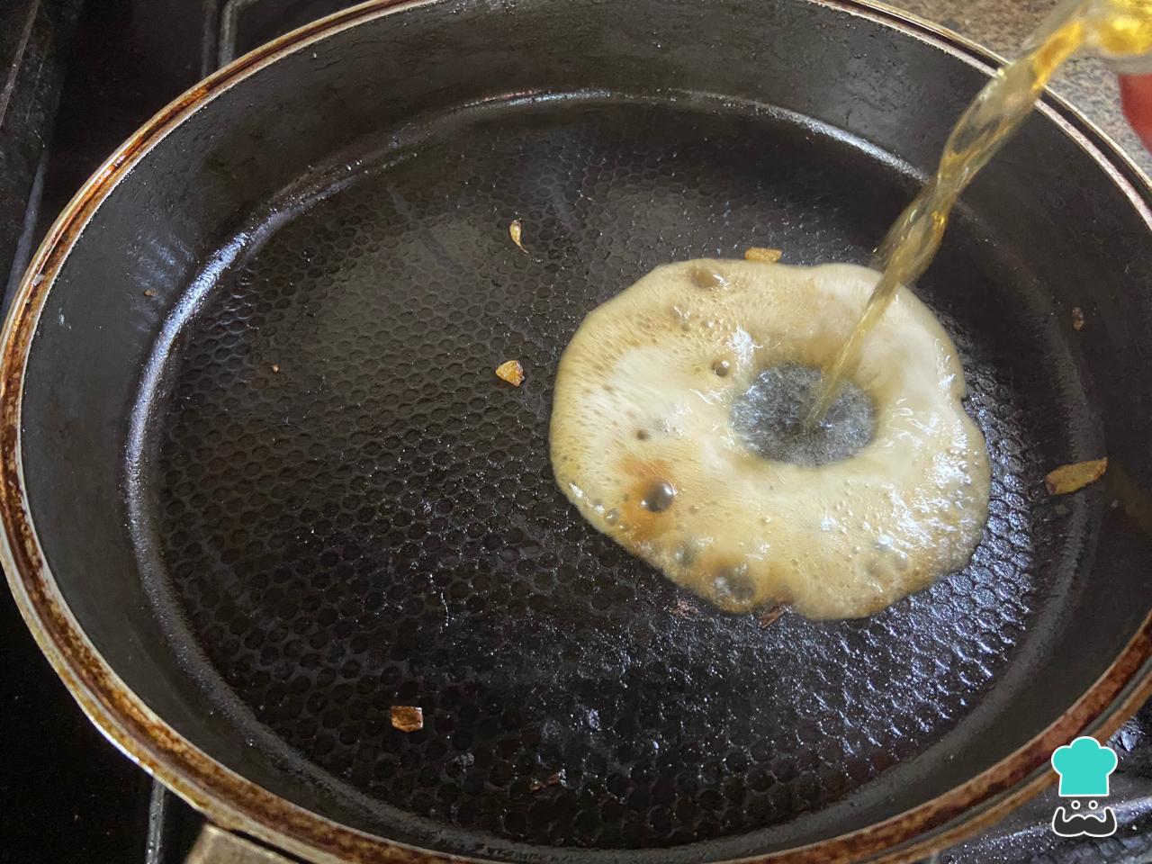Cuando estén los vegetales, retíralos y vuelve a poner la sartén sobre el fuego. Vierte la cerveza para recuperar todo el sabor de la bondiola y los vegetales. Espera que evapore el alcohol, retira del fuego y agrega los condimentos (sal, pimienta, ají molido, romero y tomillo).