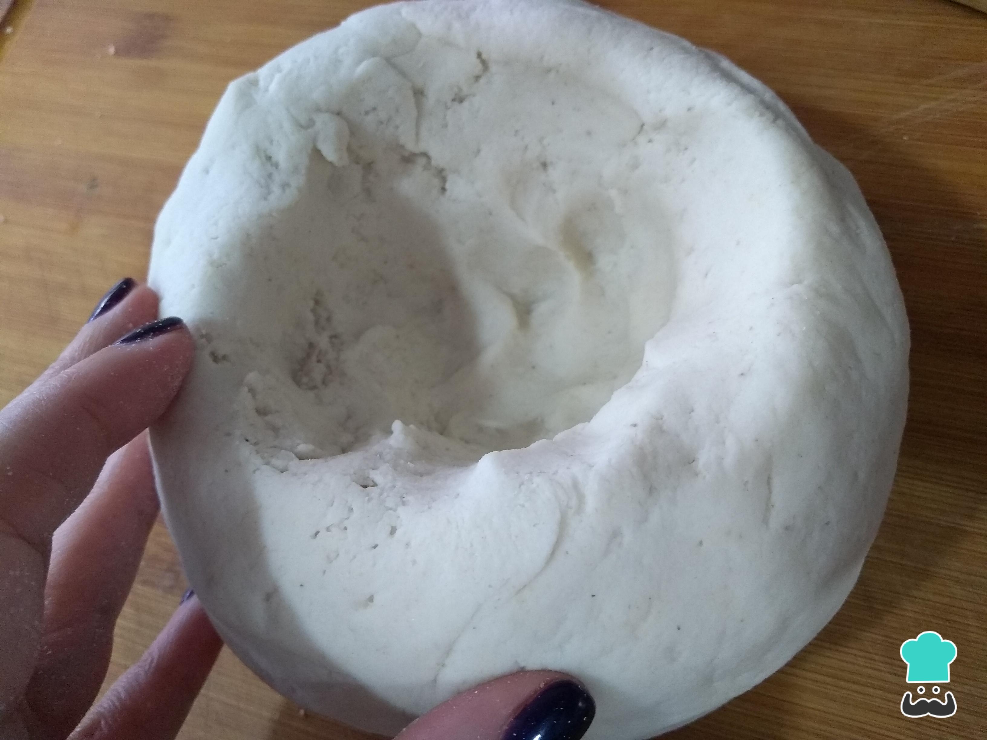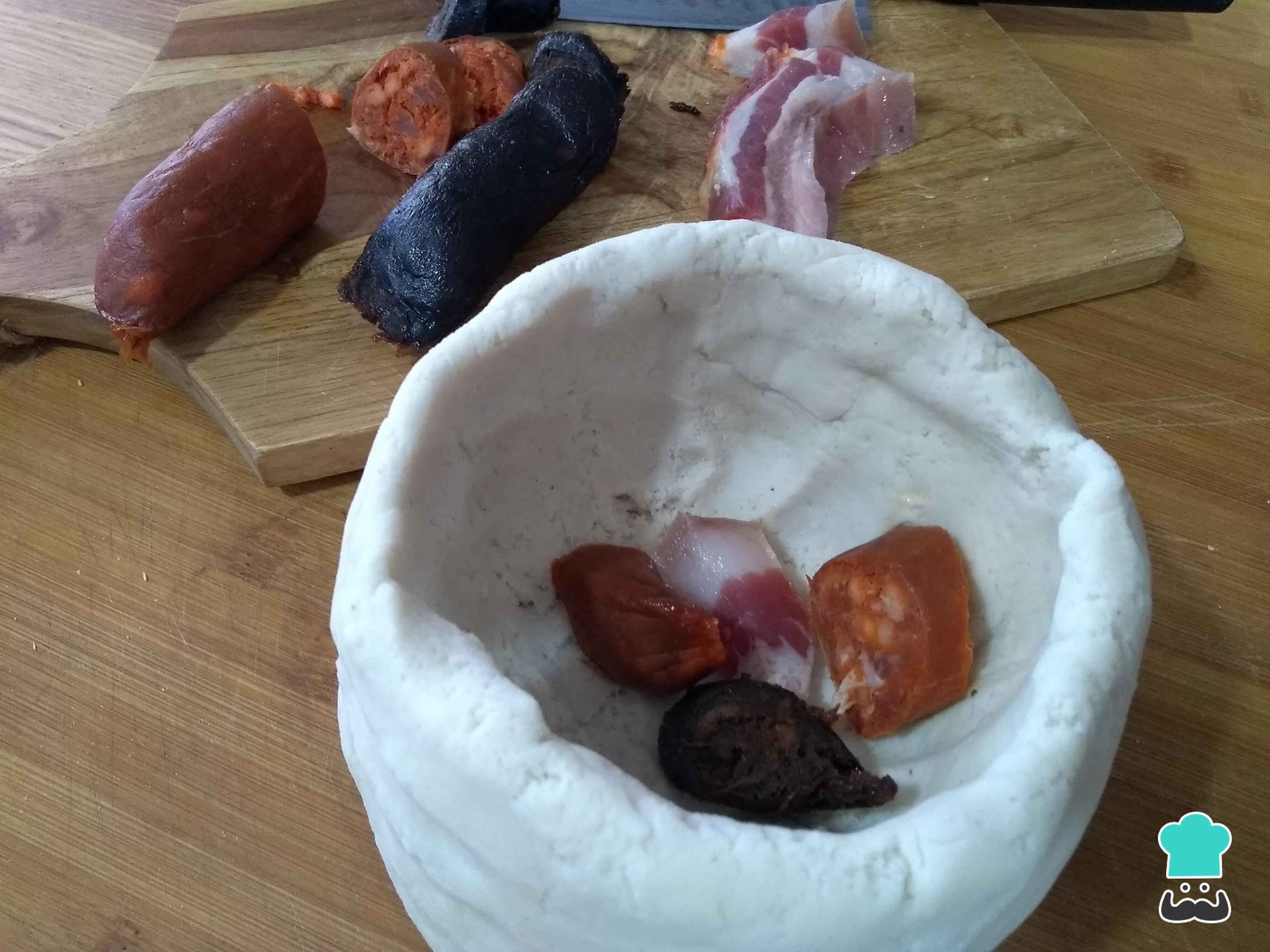 Pasado este tiempo, vuelve a trabajar la masa por un par de minutos y moldéala haciéndole un hueco en la parte central. Aquí es donde meterás los embutidos y la carne.