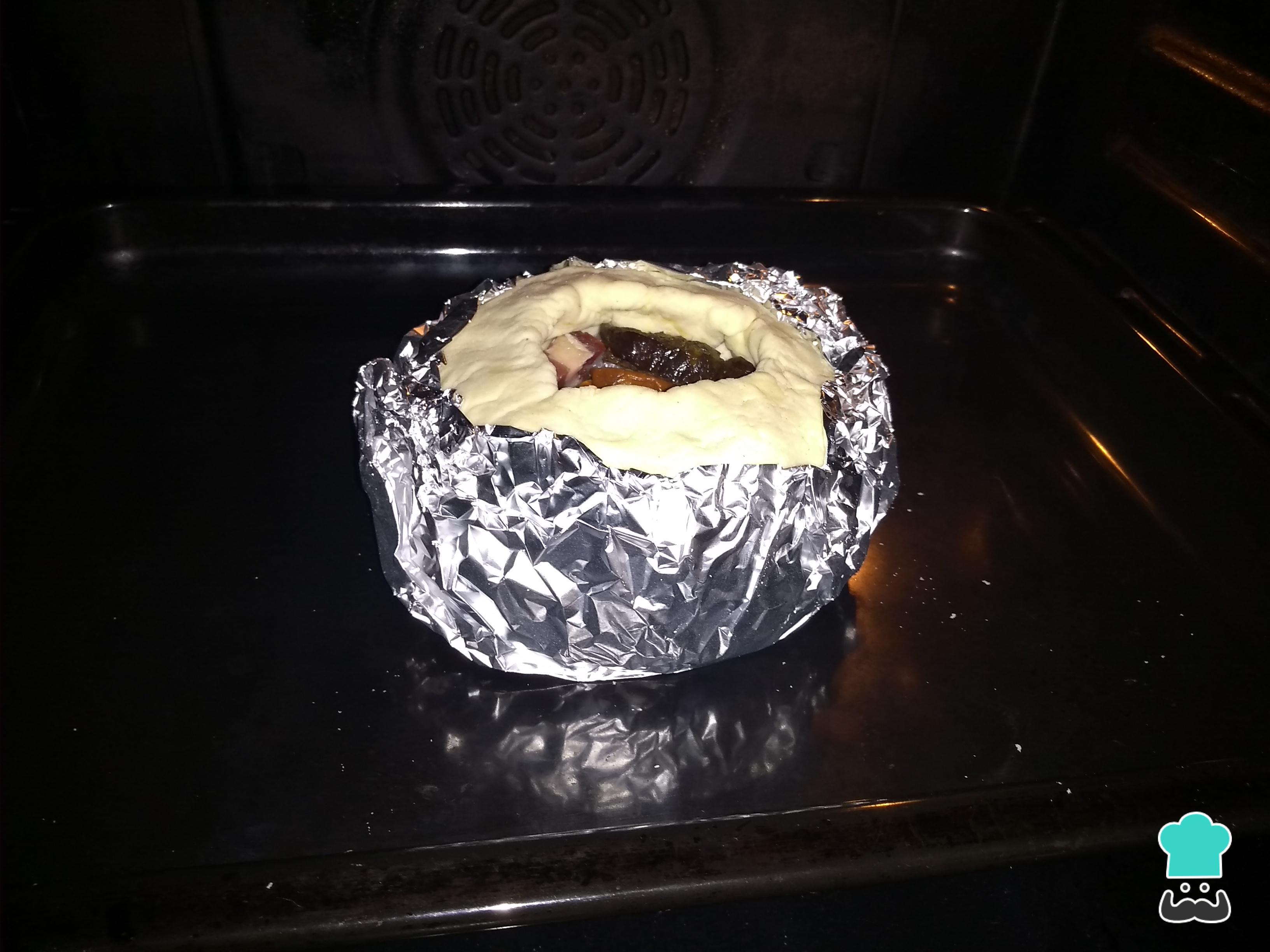 Puedes cerrar y dejar la masa cubierta totalmente para que se quede como una hogaza de pan, o bien dejarla abierta para que se vean los ingredientes. En este caso la hemos dejado abierta. Pon el horno a precalentar a 200 °C.