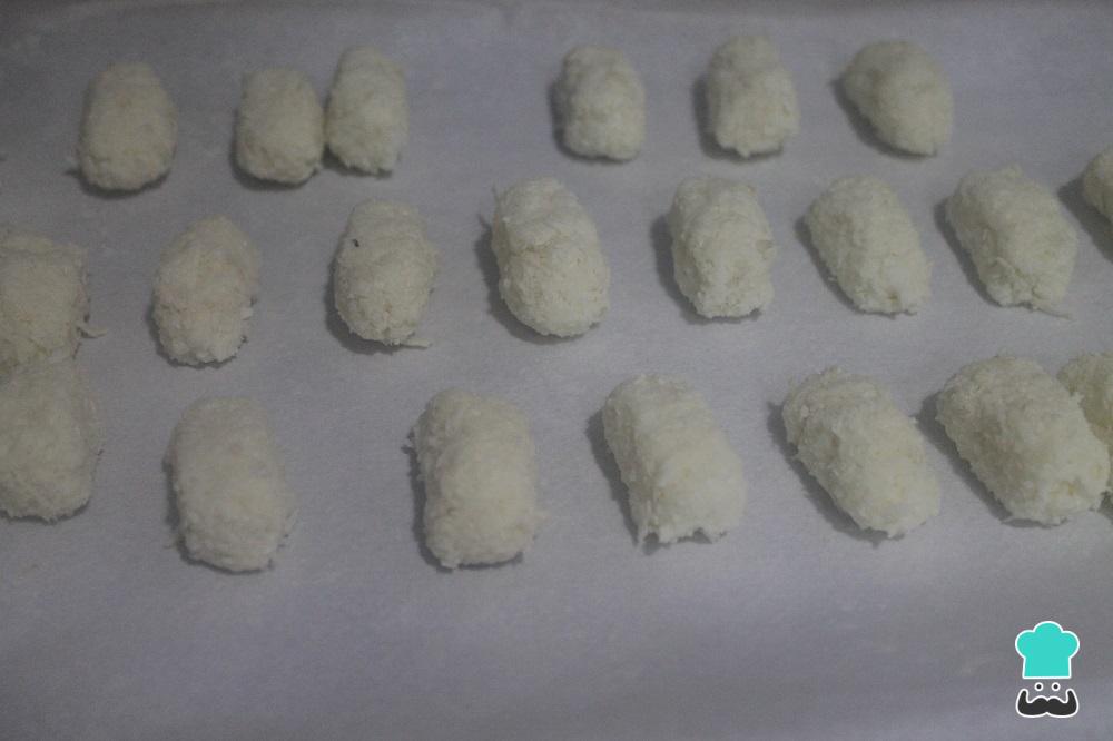 Forramos una bandeja con papel de horno. Cogemos con la mano pequeñas porciones de la mezcla de coco y leche condensada y formamos los bounty de chocolatina dándole una forma alargada. Vamos colocando las porciones en la bandeja y una vez esté toda la masa utilizada, metemos los bounty de coco en la nevera para que se endurezcan un poco (con unos minutos bastará).