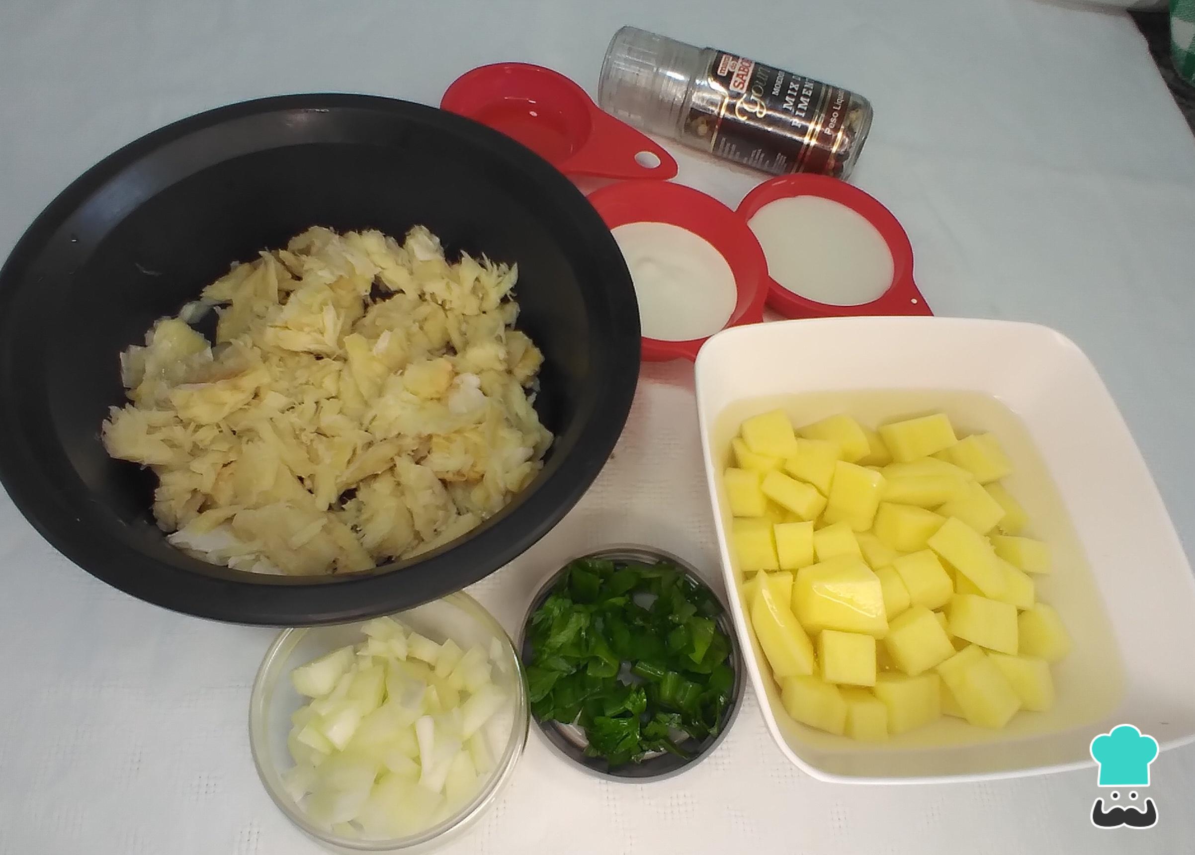 Limpia y desala el bacalao, desmenuzándolo también para esta preparación. A continuación, corta las patatas en cubos pequeños para que se cocinen más rápido y de manera uniforme. Corta también la cebolla en dados pequeños, el cebollino y el perejil picados. Separa la leche y la nata.