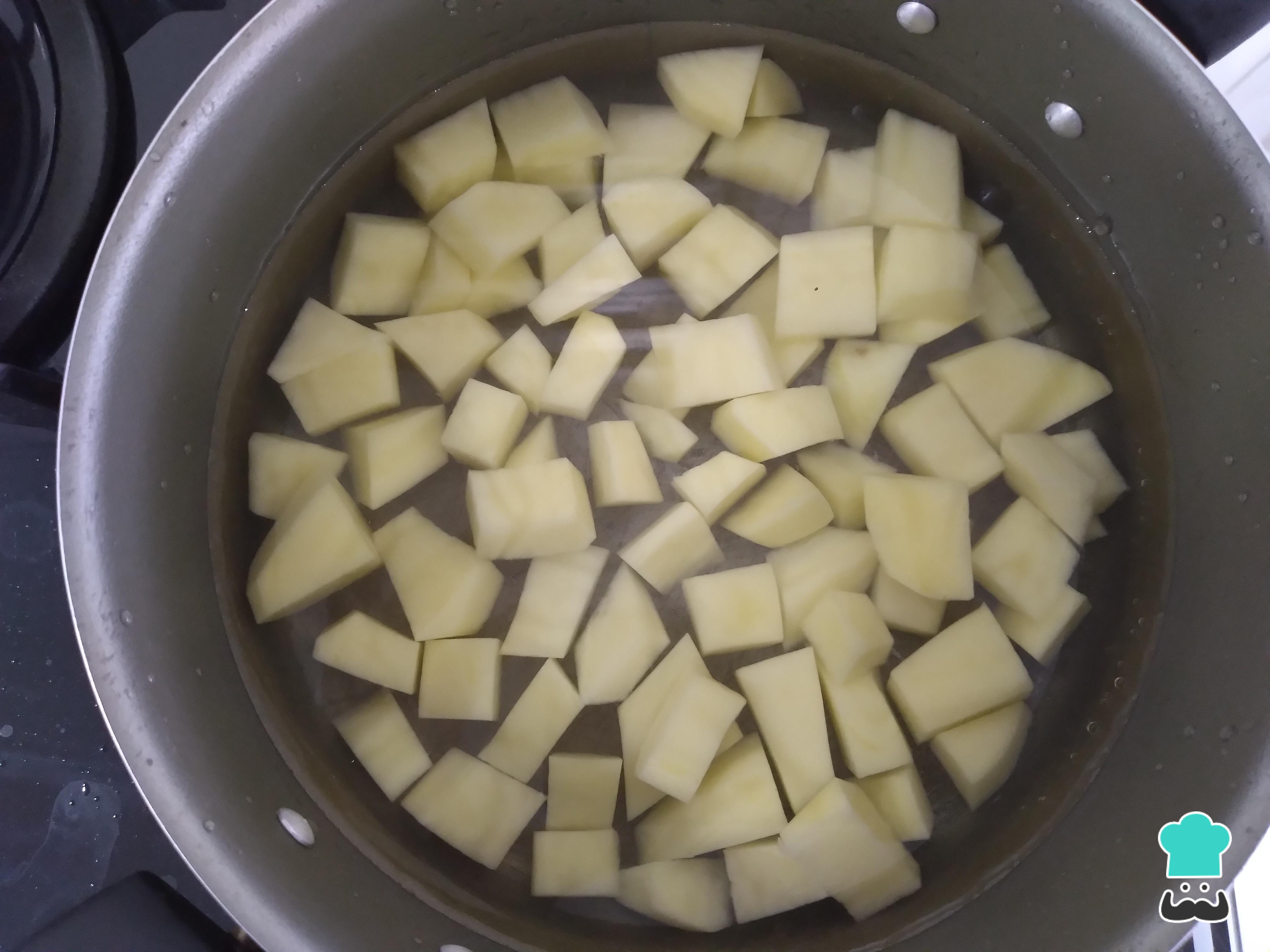 A fuego medio a alto coloca una cacerola con agua y las papas a cocinar, déjalas cocer hasta que estén blandas. Añade un poco de sal al agua de cocción de las patatas.