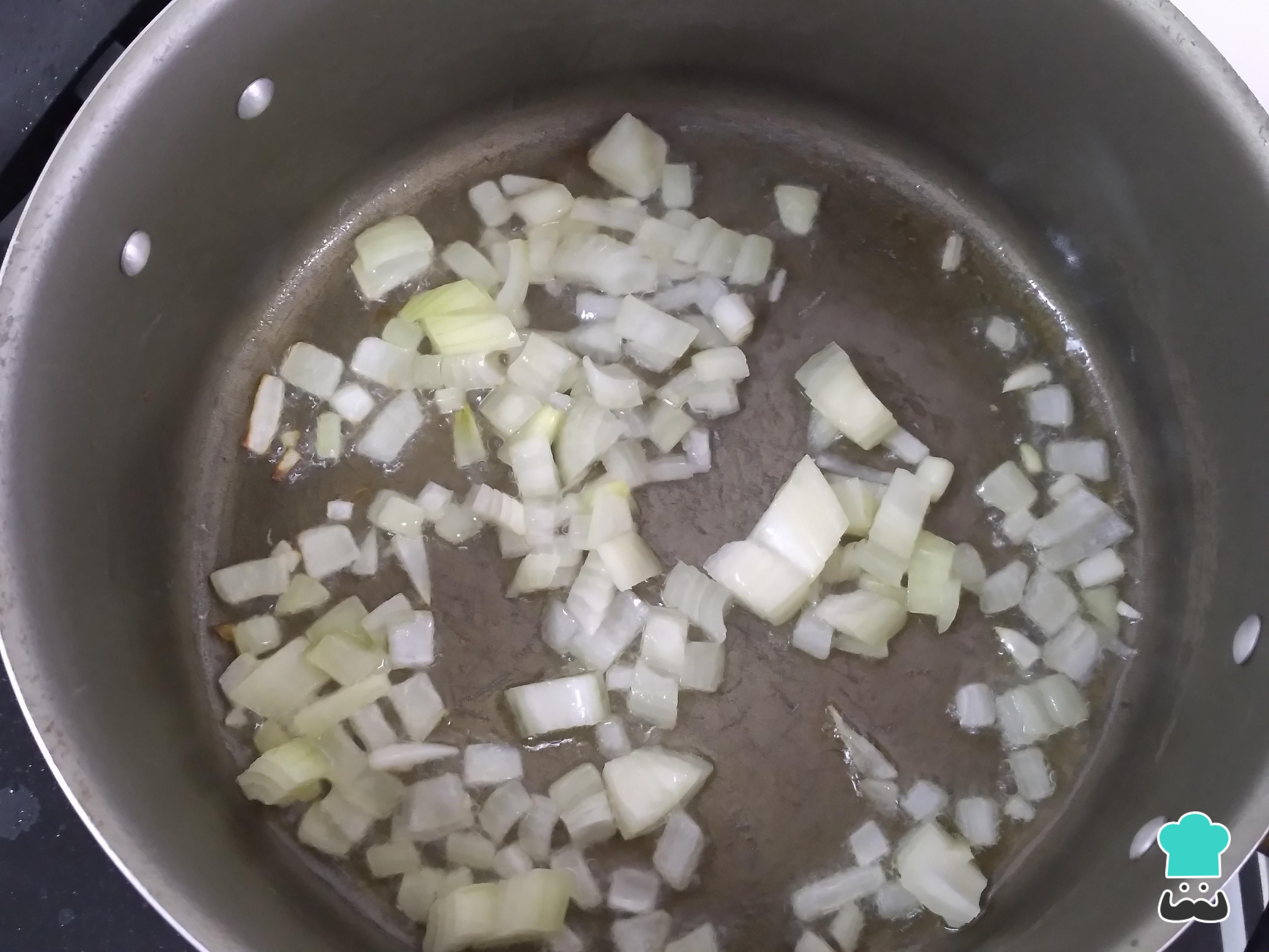 En una sartén añade el aceite de oliva y la cebolla blanca finamente picada, deja sofreír.