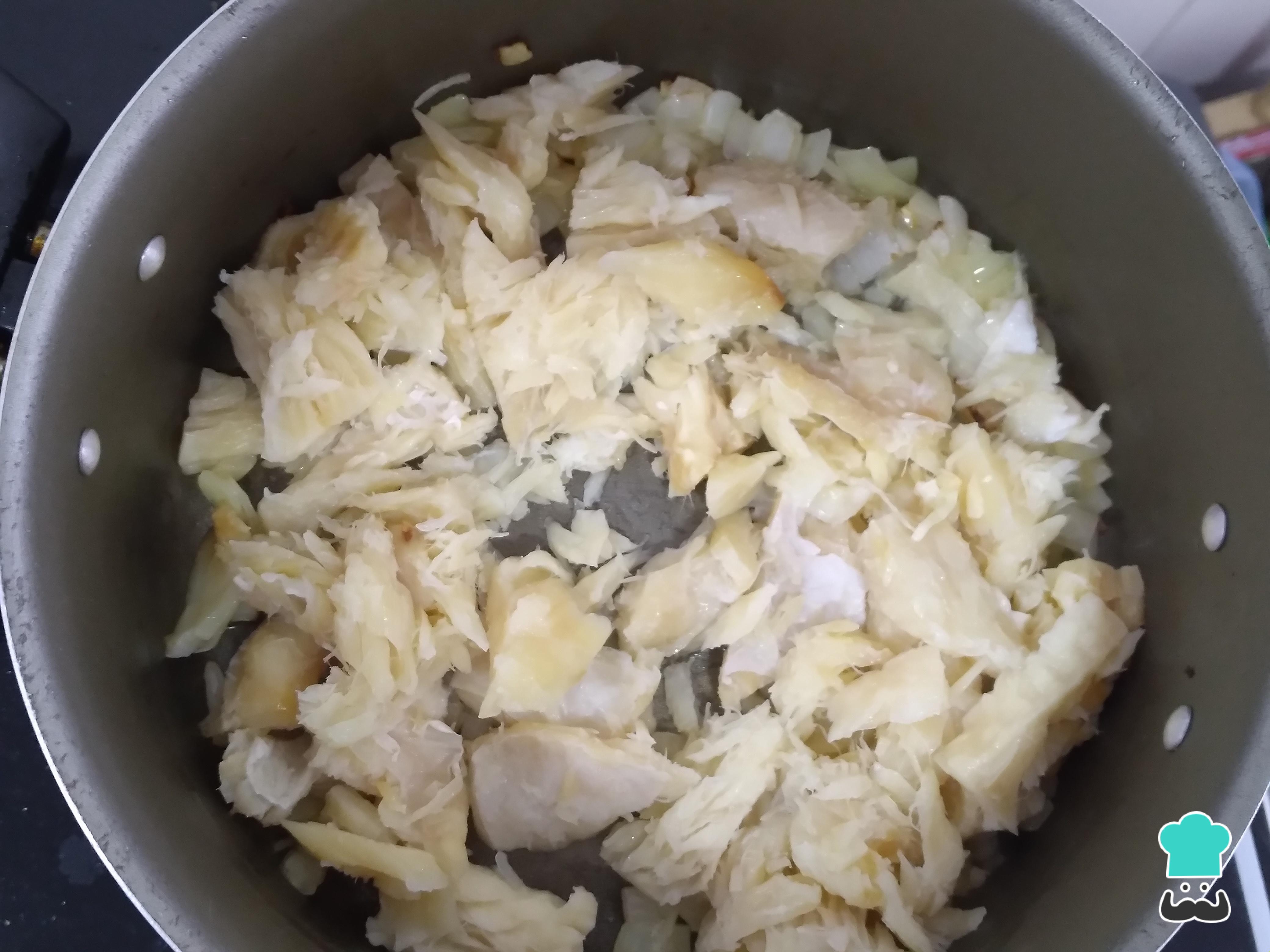 Añade el bacalao desmenuzado y sofríe un poco, mezcla bien para incorporar los sabores. Agrega el ajo y la cebolla en polvo.